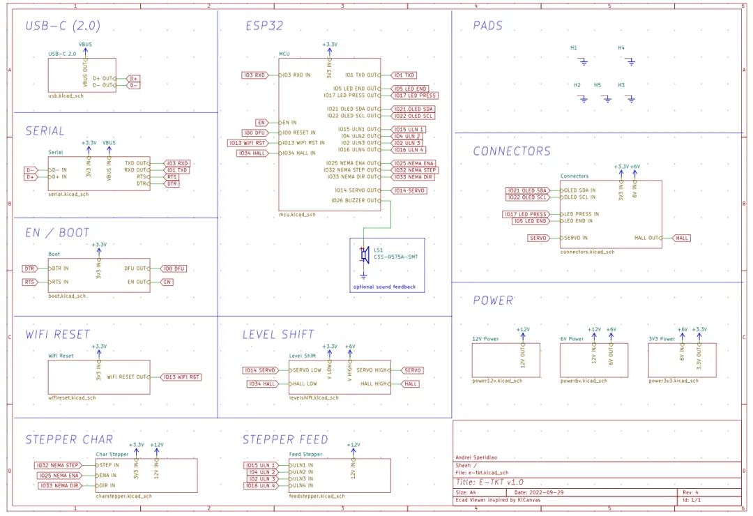 - PCB 打样采购:下载项目 KiCad 设计文件(E-TKT-main.zip)打样 PCB,按 BOM 采购 ESP32、步进电机、舵机、通用接口等元器件,均为市面通用型号;