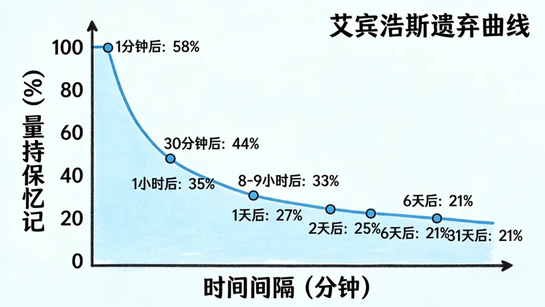 将这些数据绘制为曲线后,一个关键特征变得清晰:遗忘速度并不恒定。曲线在最开始急剧下降——20 分钟内遗忘了40%以上;然后下降速度逐渐放缓;31 天后,仍然有约 21%的记忆内容被保留。