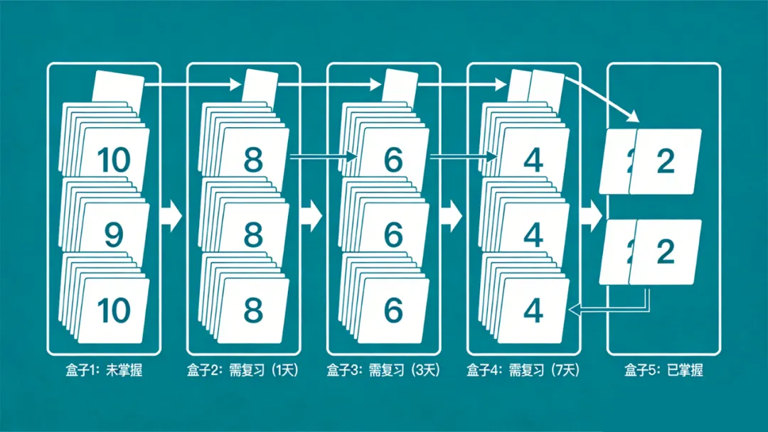 莱特纳系统的工作原理是:学习者将闪卡放入五个盒子中,第一个盒子每天复习,第二个盒子每两天复习,第三个盒子每周复习, 以此类推。如果一张卡片被正确回忆,就移到下一个盒子;如果错误,就移回第一个盒子。
