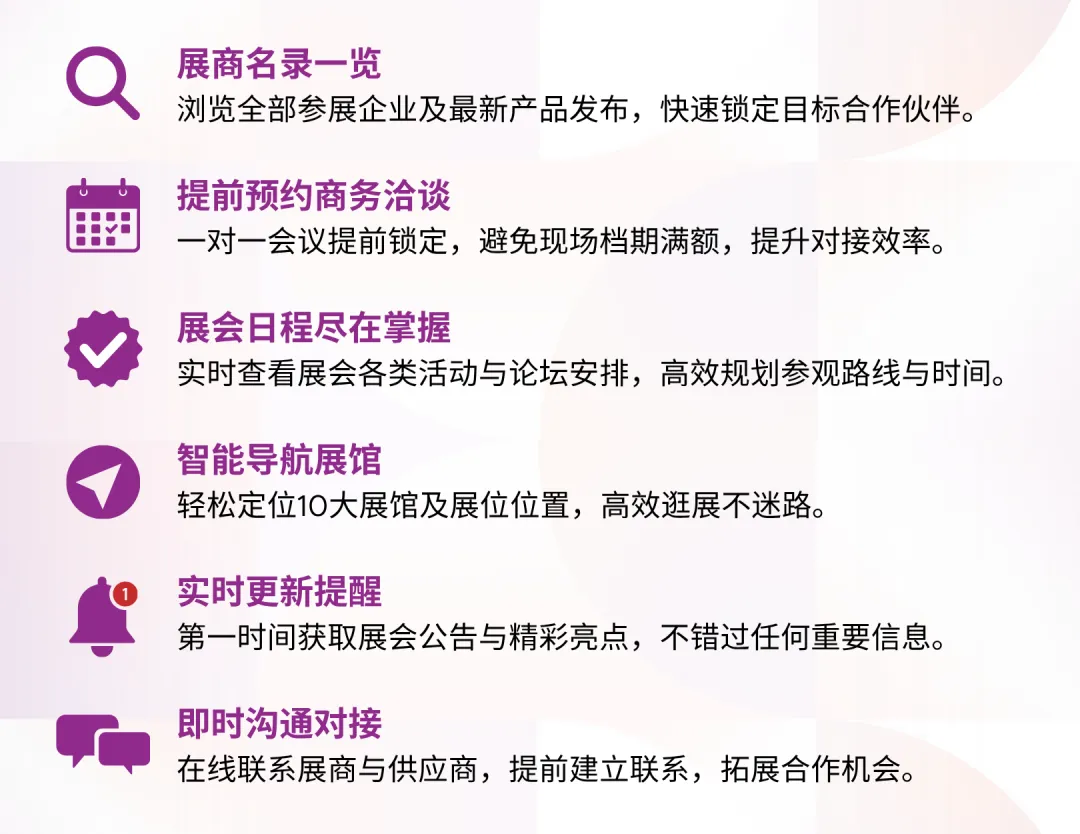 立即下载并使用官方APP,提前预约一对一商务洽谈,精准锁定核心展商,构建高效对接路径。