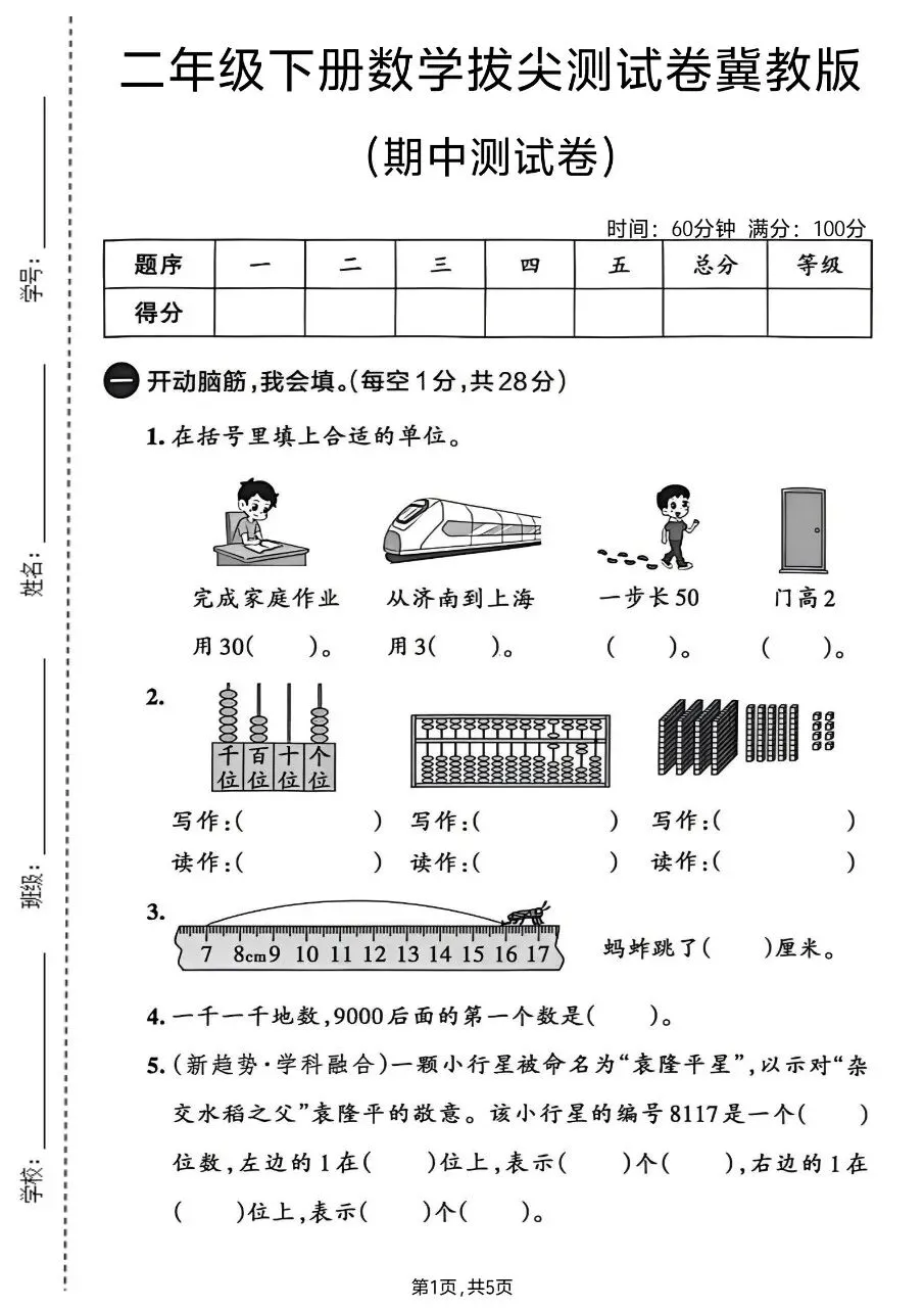 二年级下册数学冀教版(期中测试卷一)电子版免费领取含答案