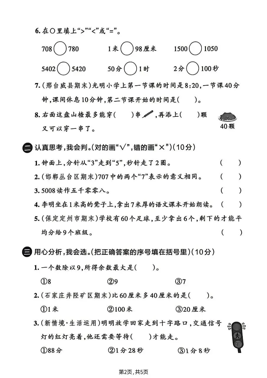 2. 括号填数与比较:会填括号里最大能填几的数,如()×5<43,填8;能正确比较万以内数、长度单位、时间的大小,如708<780,1米>98厘米。