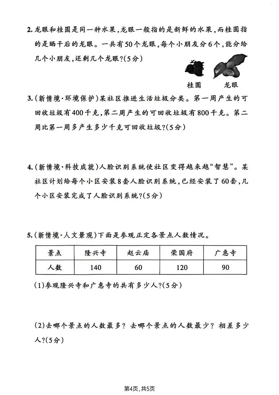 2. 加减法实际应用:解决数量比较、求和问题,如第二周比第一周多产生的可回收垃圾量,以及景点人数求和、差值计算。