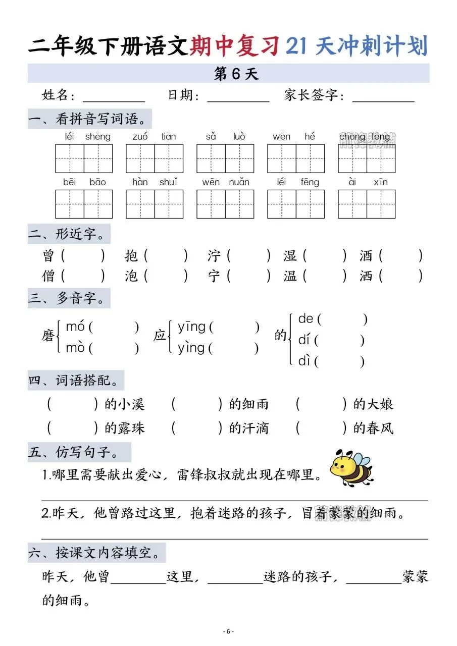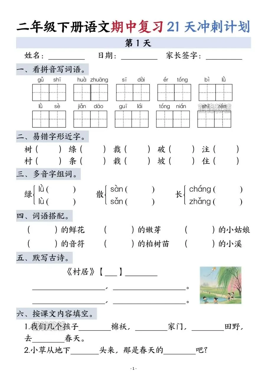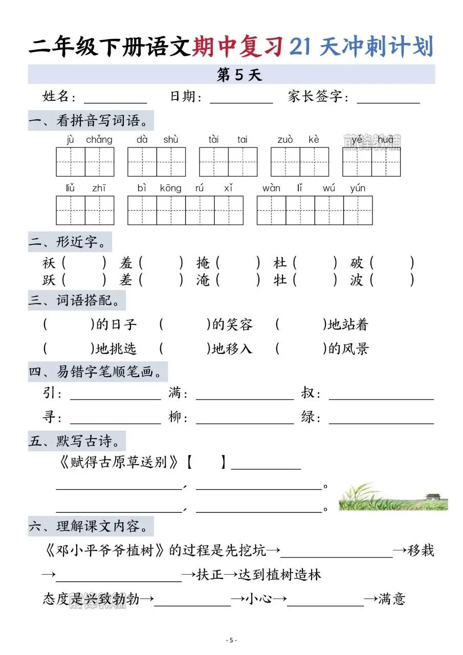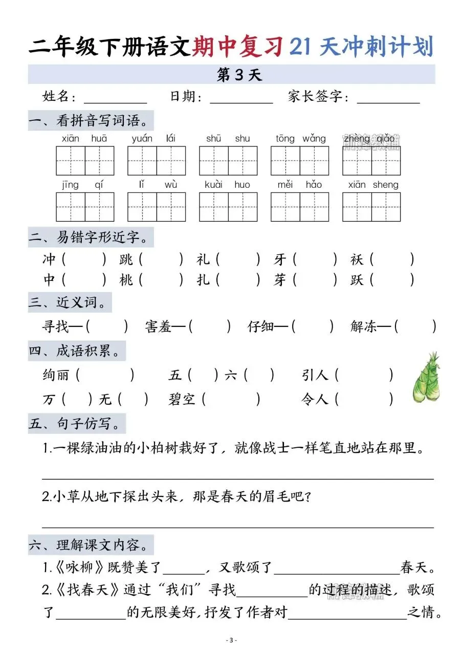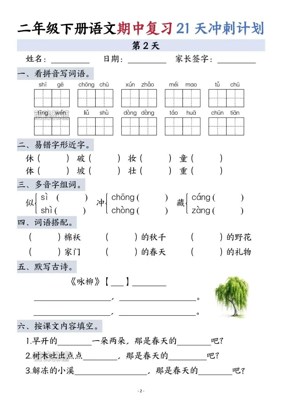 二年级下册语文期中复习21天冲刺计划电子版免费领取