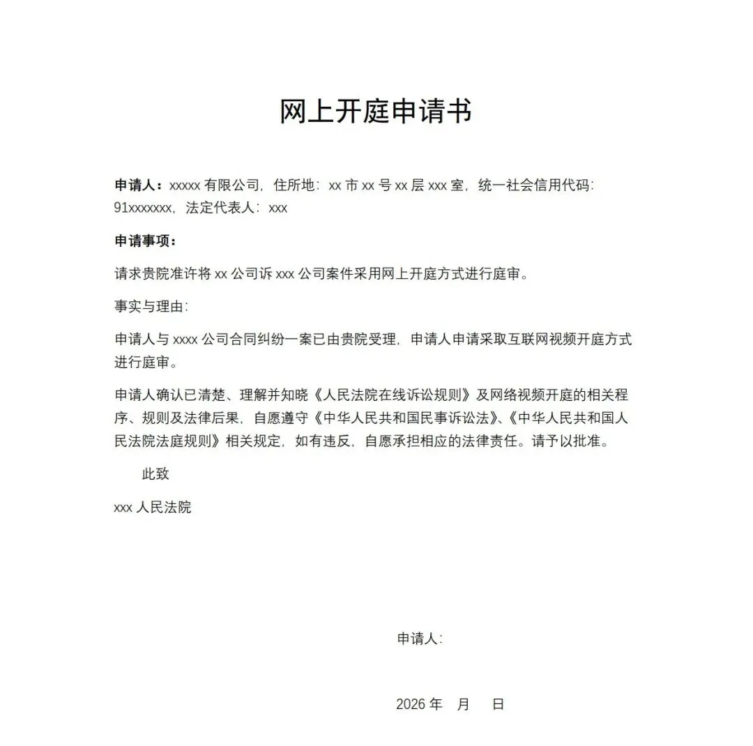网上开庭申请书模板,WORD文档电子版,可免费下载打印