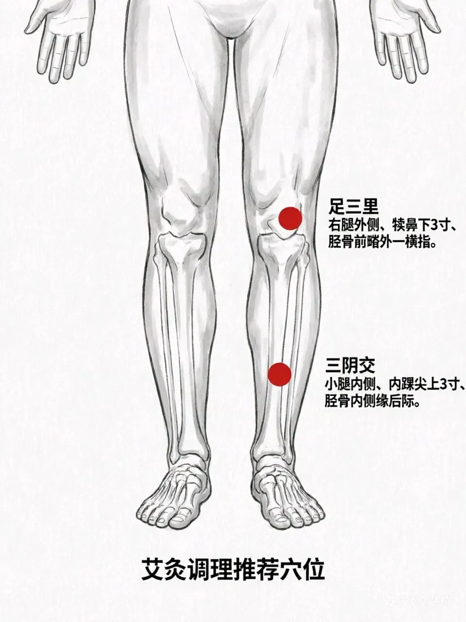 – 三阴交(补血要穴):脚踝内侧上方,四指宽的位置(如图)。睡前按揉3分钟,对女性月经不调特别有帮助。