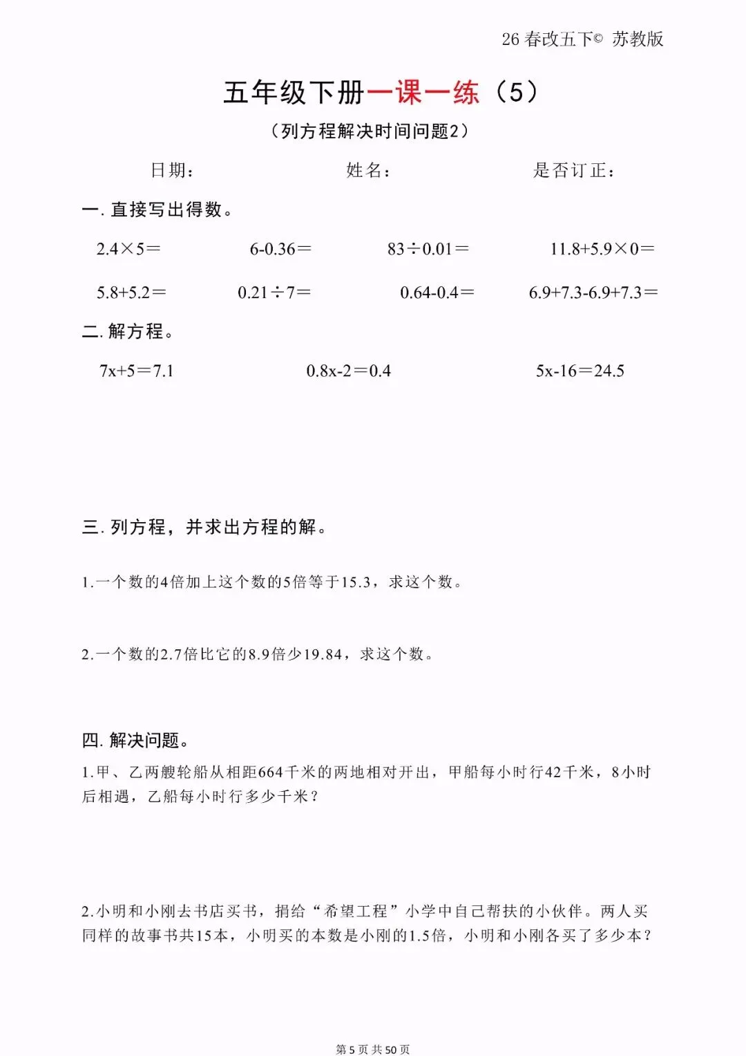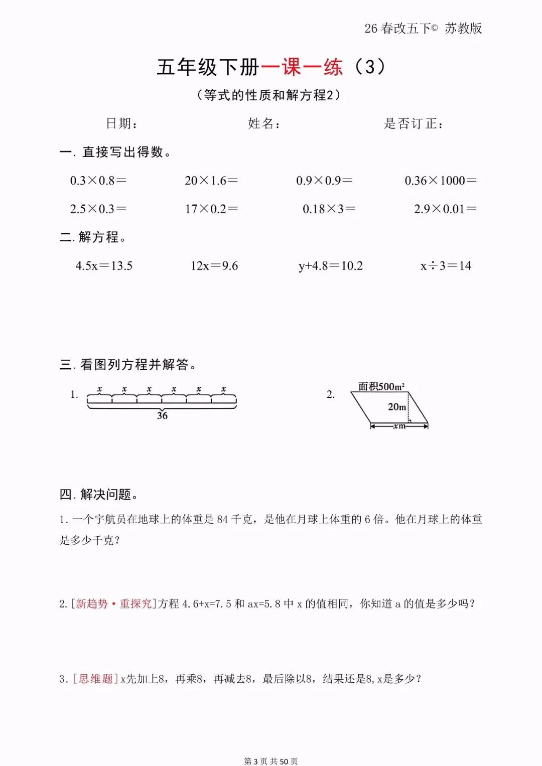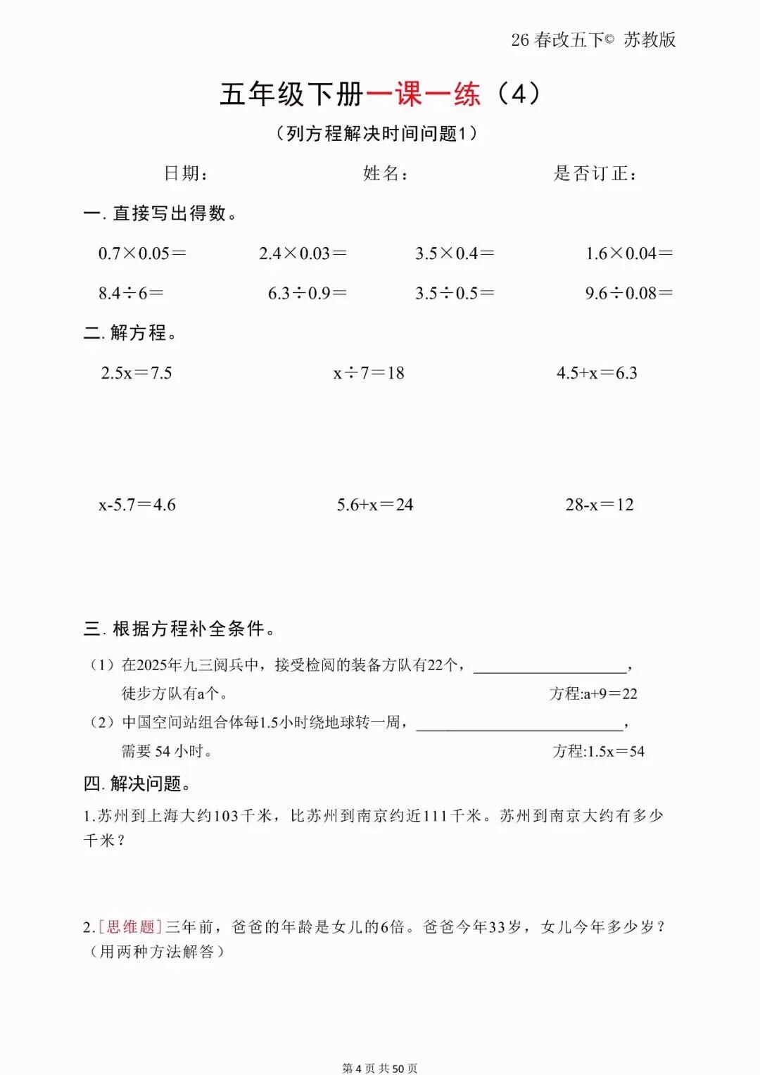 26新五年级下册数学苏教版一课一练,高清电子版可打印 大家好,我是多雅妈妈,今天分享的是26新五年级下册数学苏教版一课一练,有答案电子版可打印 (温馨提示;因篇幅有限,仅展示部分内容。 (文末有完整版电子版领取方式) 完整电子版: ①:点一点右下角的“赞”和“在看”,感谢! ②:在公众号对话框中回复:46 (不是在“留言”中发数字)