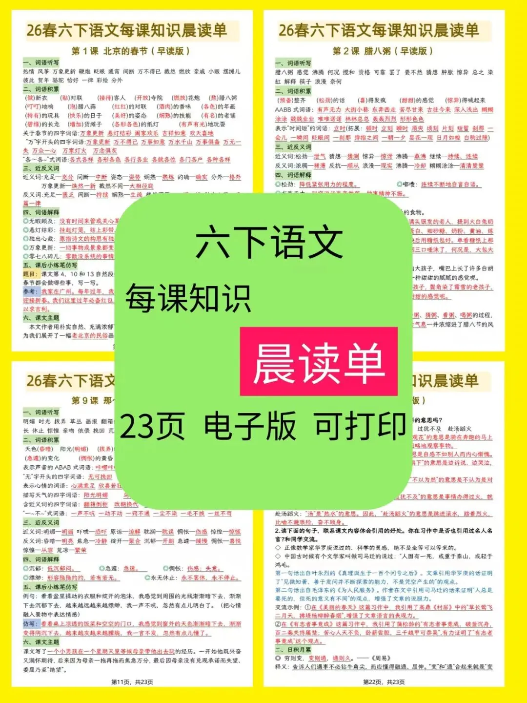 六年级下册语文的学习进入关键期,晨读是积累知识、培养语感的黄金时间!今天给大家带来一份超实用的26春六下语文每课知识晨读单,共23页电子版,可打印,覆盖全册重点,从字词积累到课文主题,从仿写练习到文言解析,一站式解决晨读难题~