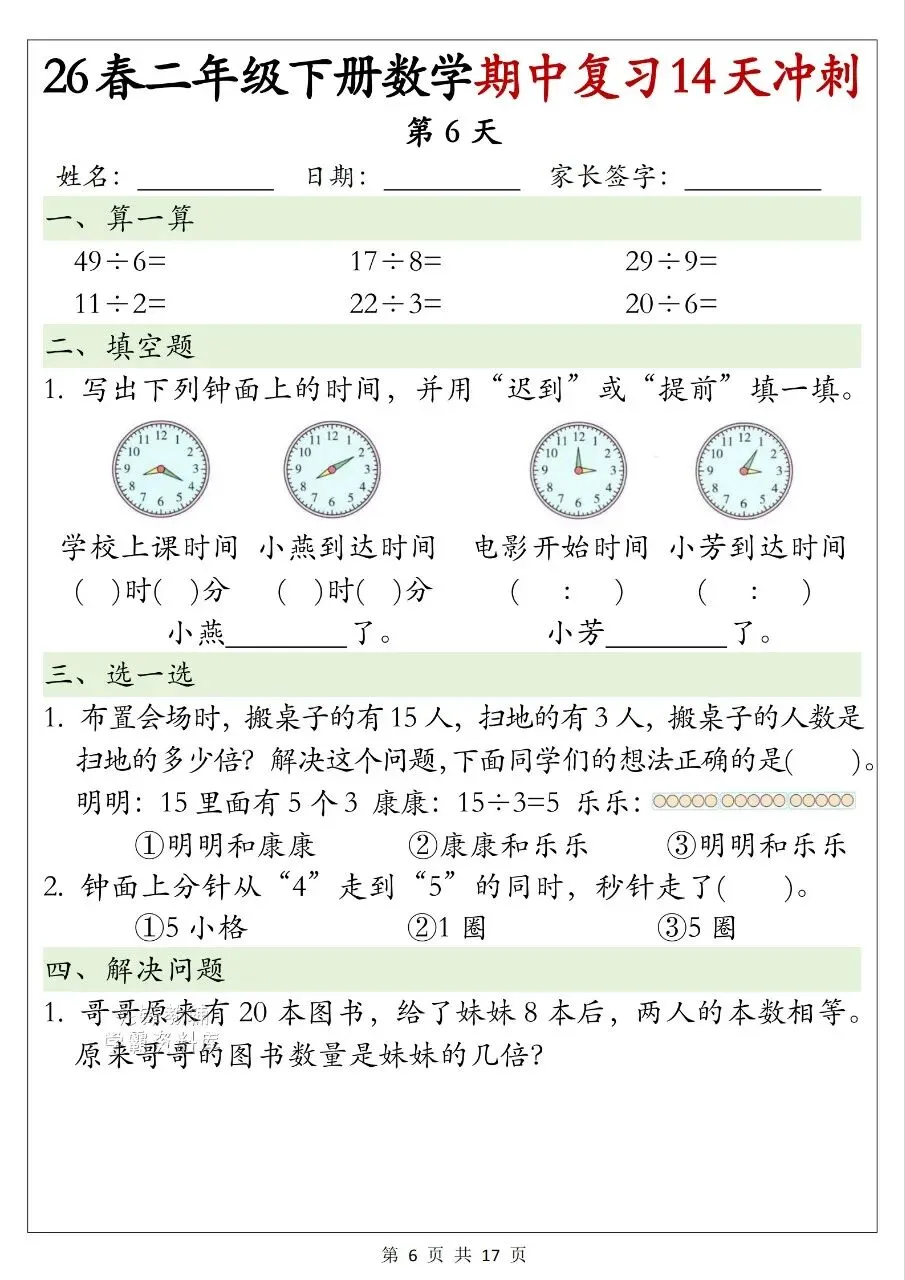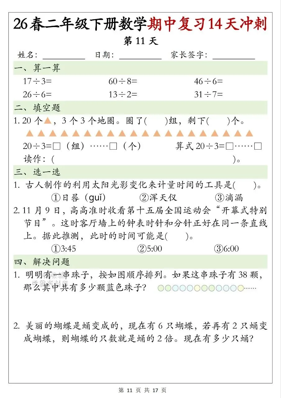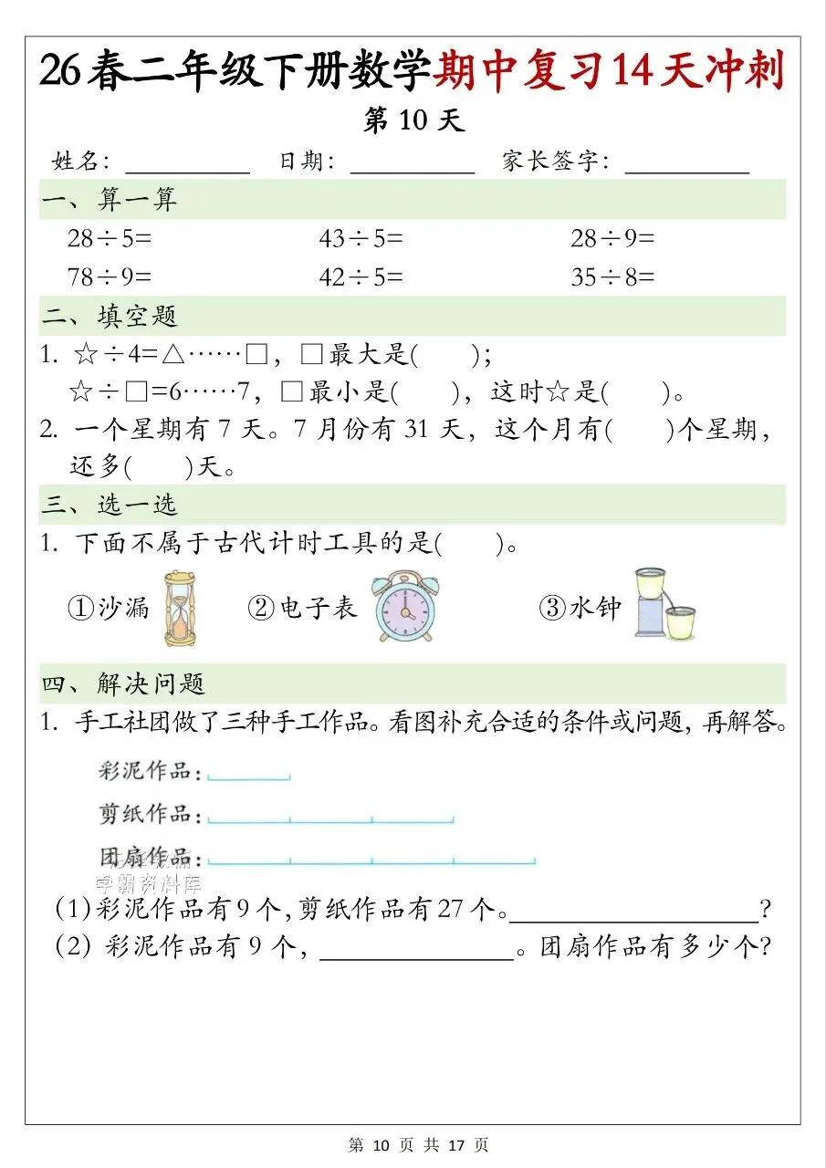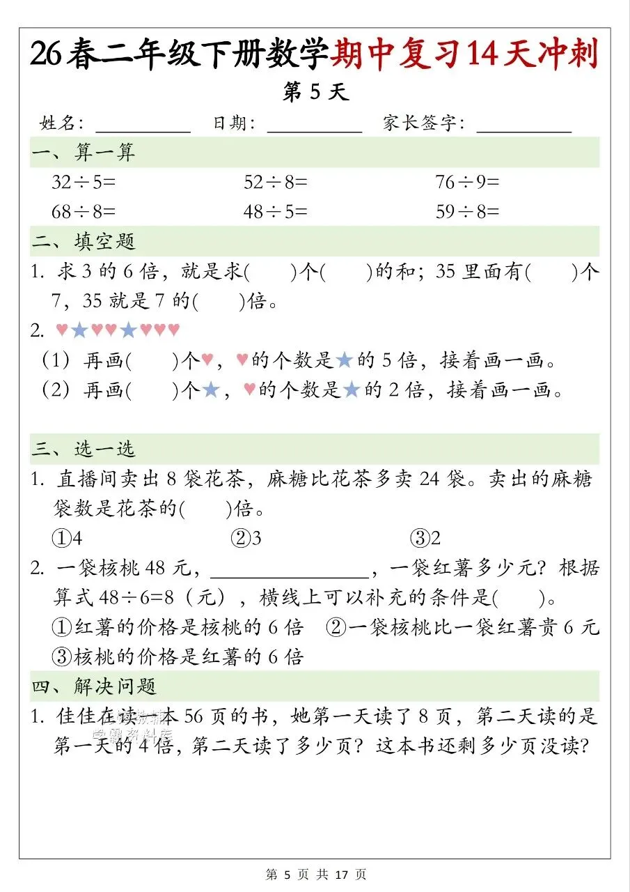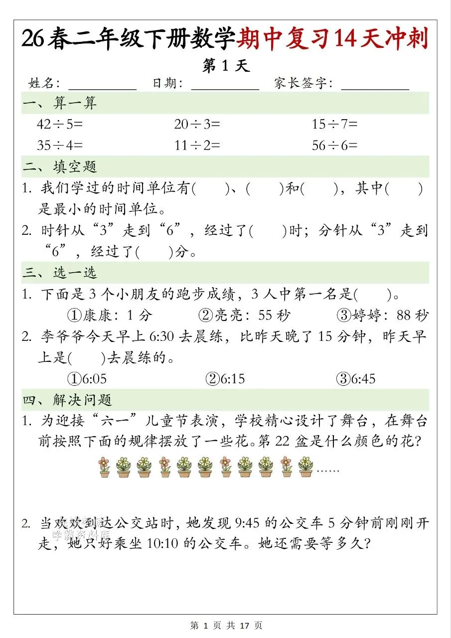 26新二年级下册数学期中复习14天冲刺(电子版可打印)