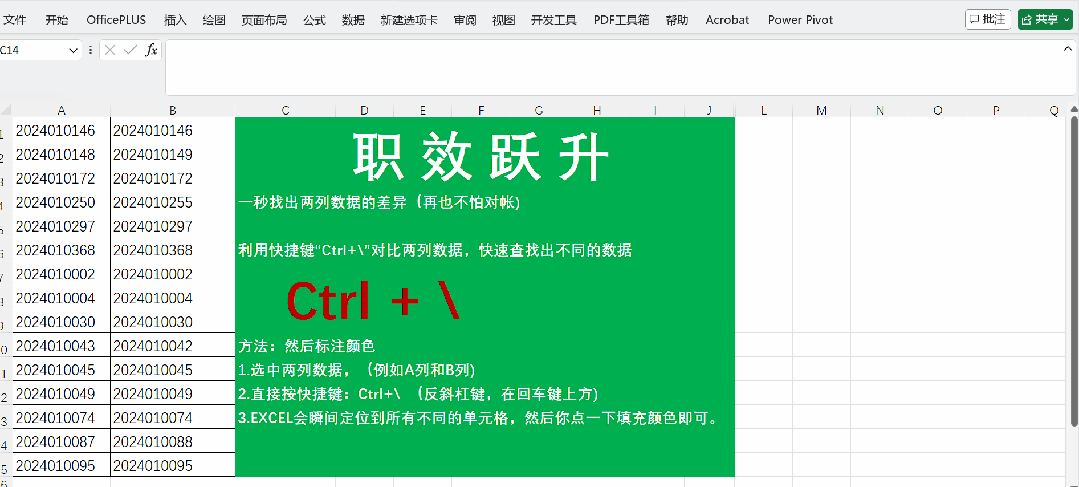 **痛点**:两列订单号,要找出哪些不一样。你还在一个一个盯着看?或者写个IF公式?