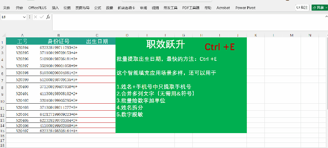 **痛点**:你有100个人的身份证号,要批量取出出生日期。很多人第一反应是去学MID函数,一看就头大。