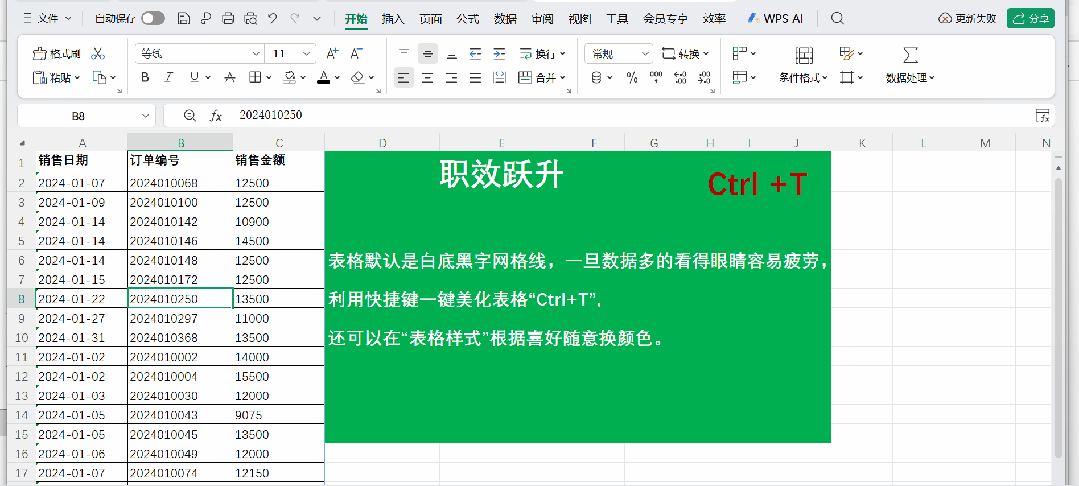 **痛点**:你做好数据后,表格默认是白底黑字网格线,一旦数据多的看得眼睛容易疲劳。
