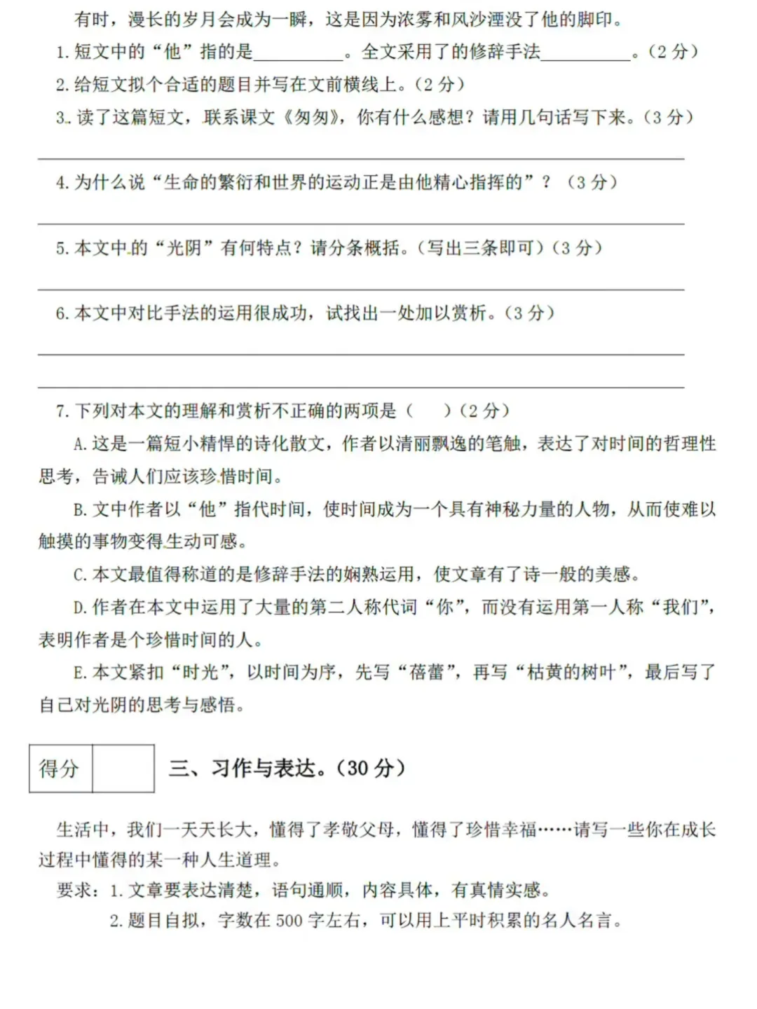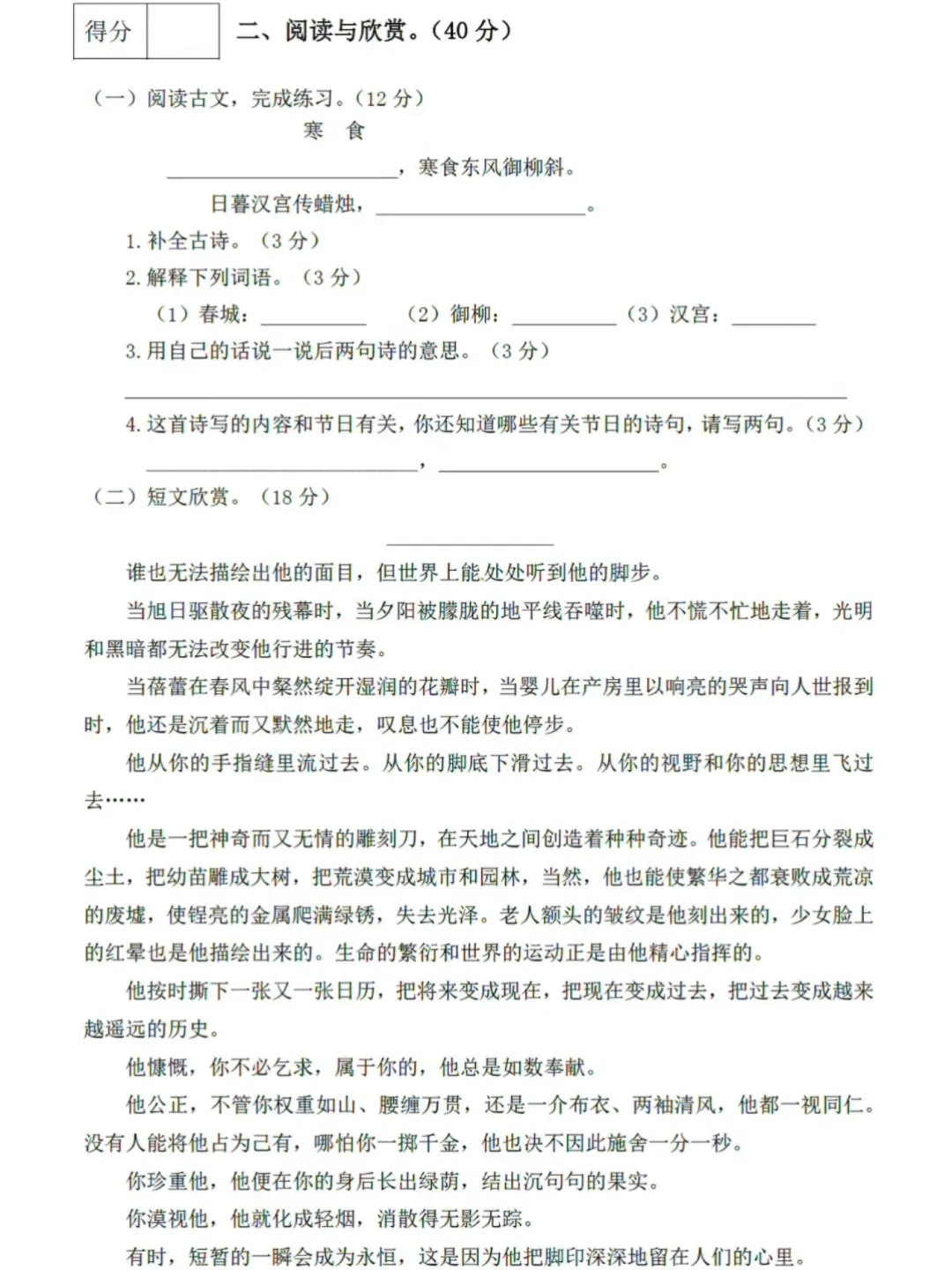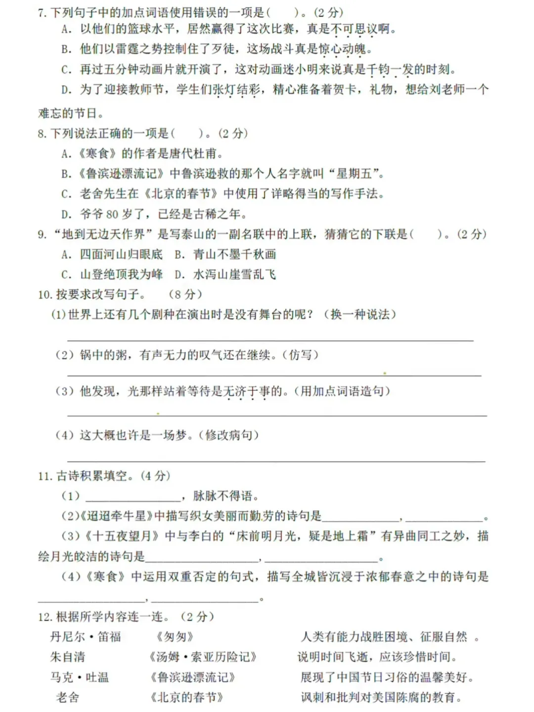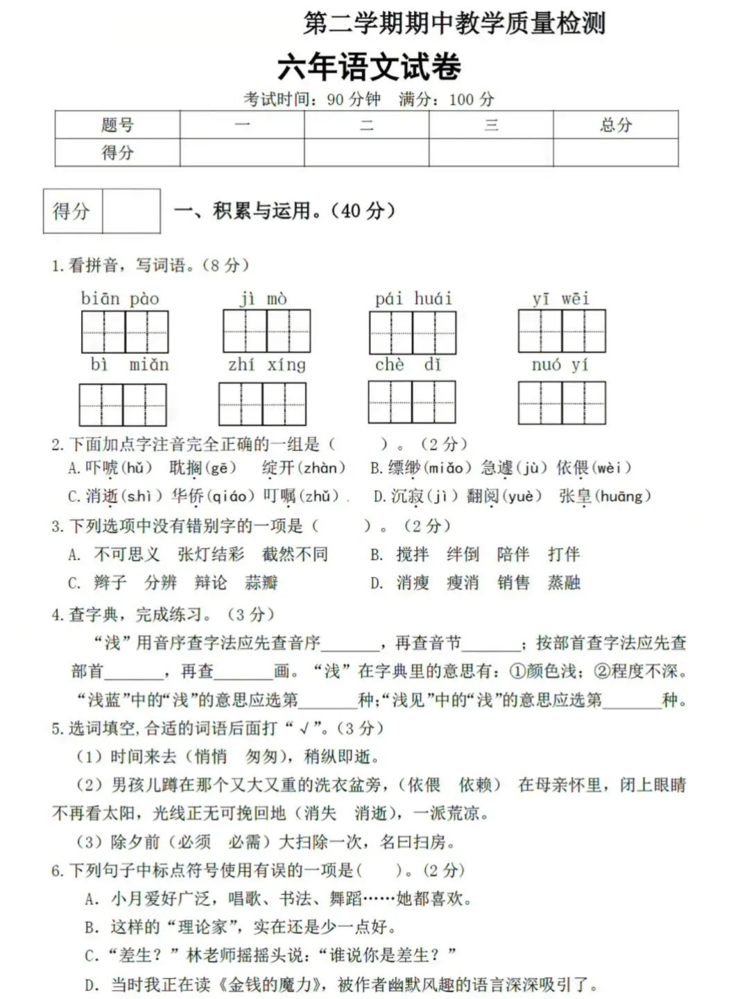六年级下册语文期中检测卷,有高清电子版可打印