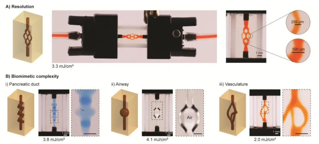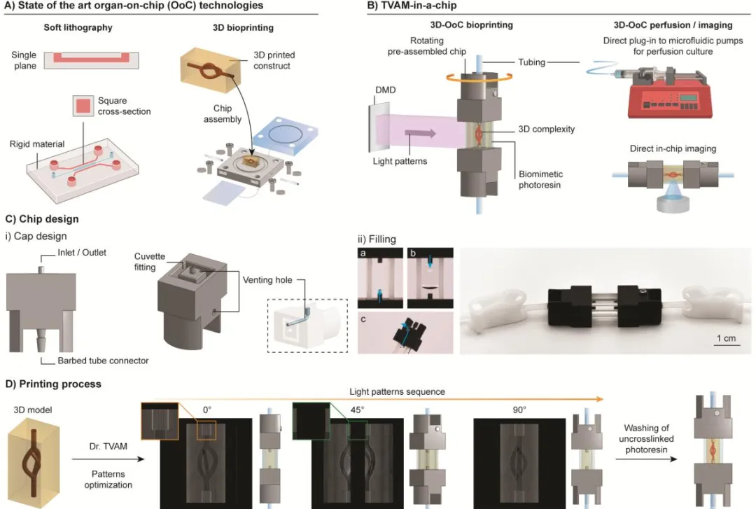针对器官芯片制造中存在后期组装复杂易失败等问题,瑞士洛桑联邦理工学院的Christophe Moser教授团队在arXiv上展示了题目为“Overprinting with Tomographic Volumetric Additive Manufacturing”的工作,通过断层扫描体积增材制造(TVAM)技术结合Dr.TVAM光学矫正算法,实现了在预制微流控芯片内部直接、无接触地快速制备高度复杂的3D生物结构这一结果,解决了在复杂光学环境和非标准条件下进行高精度原位生物制造的难题。