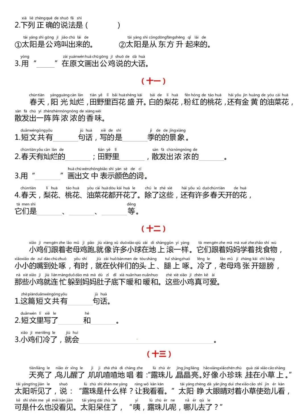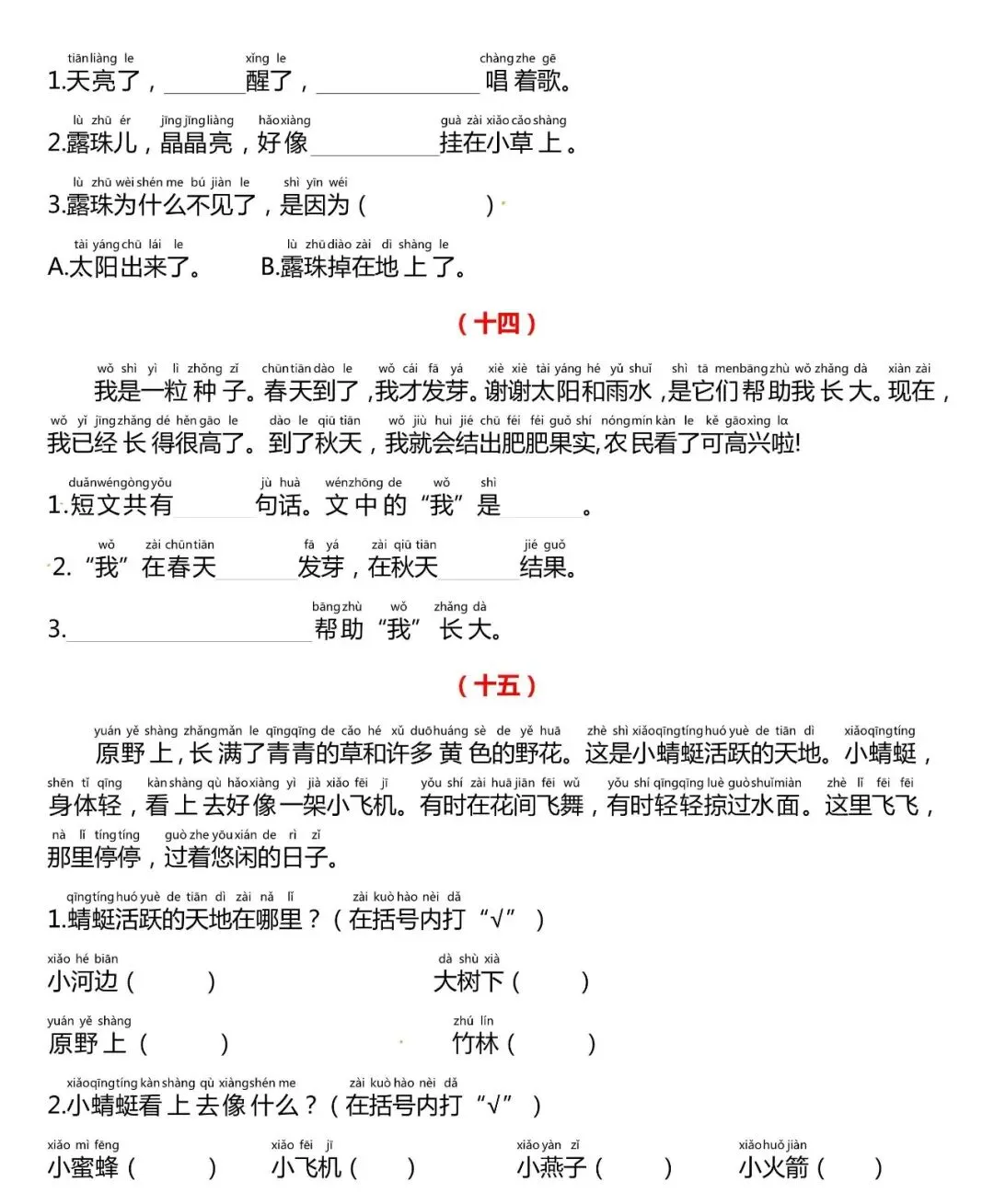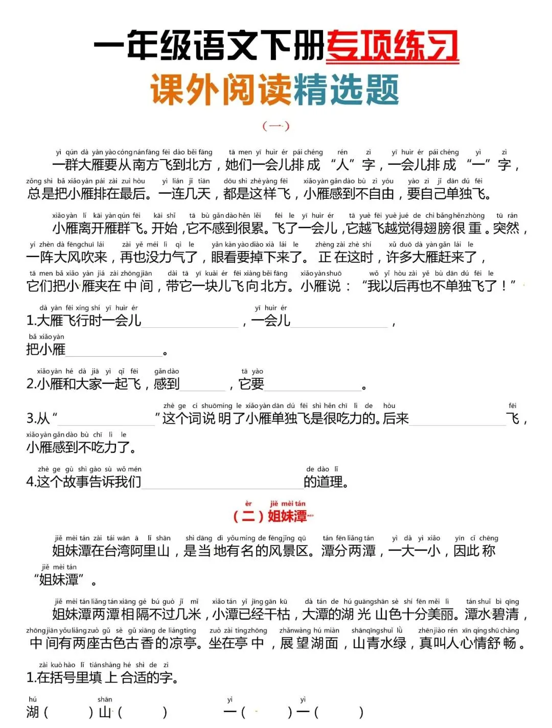 大家好,这里是淘学学资料库,这份《一年级语文下册课外阅读理解专项练习》,完整 pdf 电子档共8页。这份资料精选 15 篇带拼音的课外短文,涵盖童话、写景、写物、生活小故事等题材,每篇搭配填空、选择、画线、简答等基础题型,难度贴合一年级水平,能有效锻炼孩子阅读、审题、提取信息的能力,帮助孩子打好阅读基础。这份资料短文篇幅简短有趣,全文标注拼音,孩子可独立完成练习,无需家长过多辅导,每道题都配有清晰参考答案,方便批改与自查,每天练一篇既能增加阅读量,又能掌握答题技巧,全面提升一年级孩子的阅读理解能力与语文应试水平。
