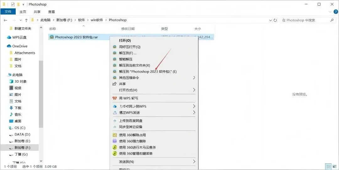 第一步:打开软件所在文件夹,选择文件右击,解压到”Photoshop CC2023软件包”。