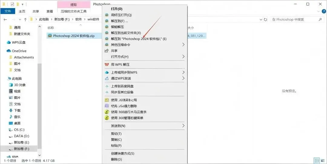 第一步:打开软件所在文件夹,选择文件右击,解压到”Photoshop CC2024软件包”。
