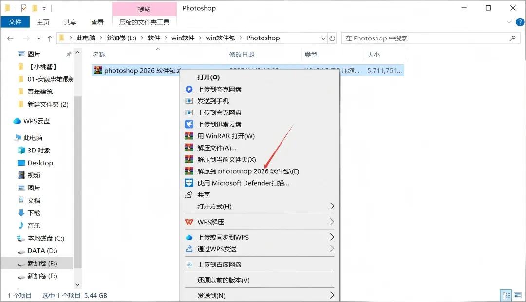 第一步:打开软件所在文件夹,选择文件右击,解压到”Photoshop CC2026软件包”。