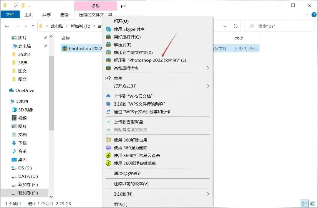 第一步:打开软件所在文件夹,选择文件右击,解压到”Photoshop CC2022软件包”。