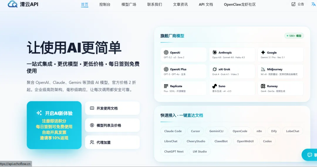 清云API – 集成GPT-5.4/Claude 4.6/Gemini 3.1/Deepseek/豆包等580+大模型接口