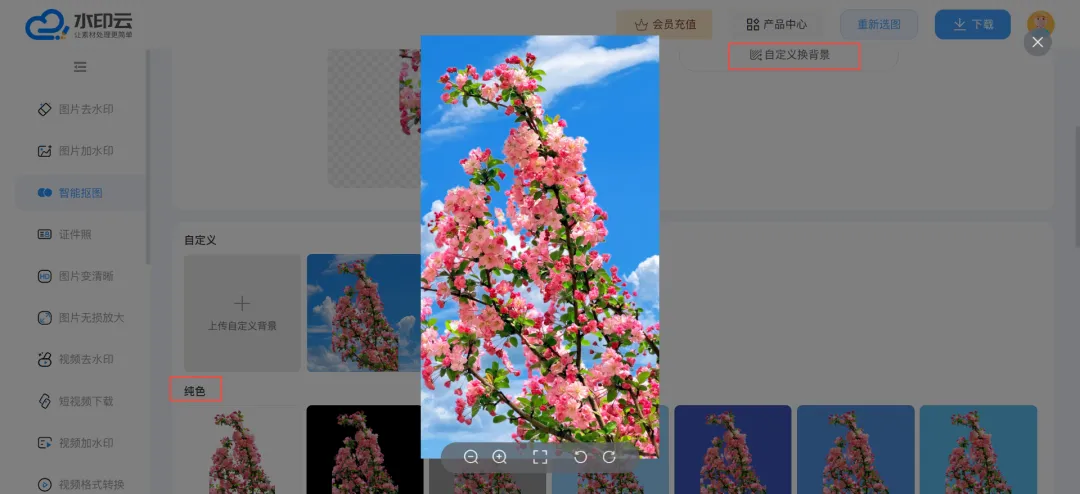 3、可点击“换背景”选择纯色底或模板背景,设置完成后,点击“下载”按钮,即可导出无水印透明底图片