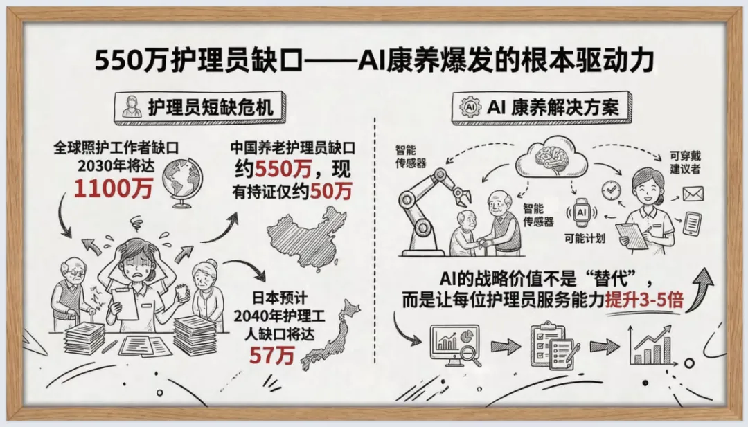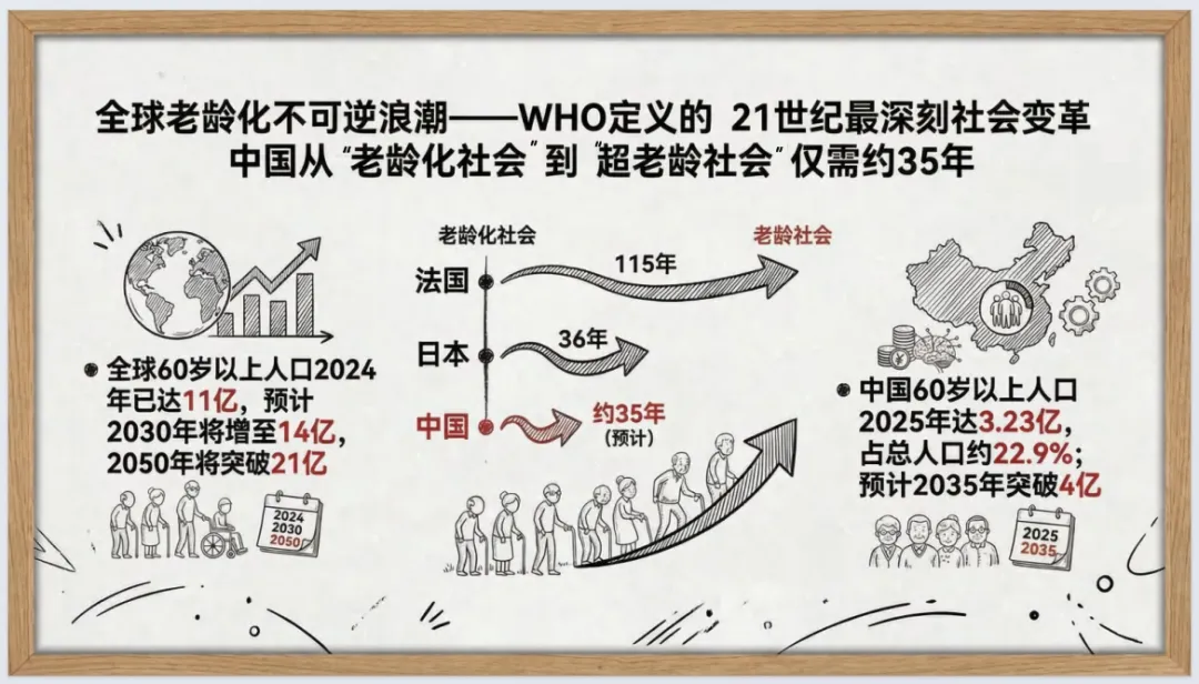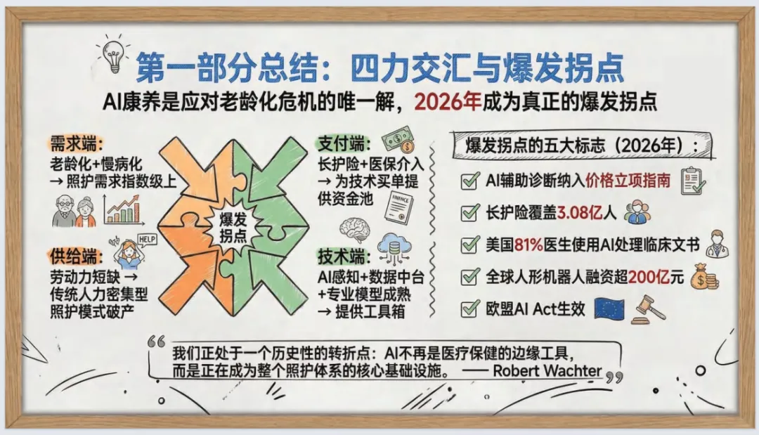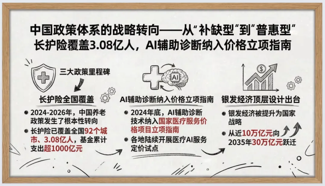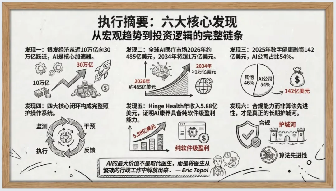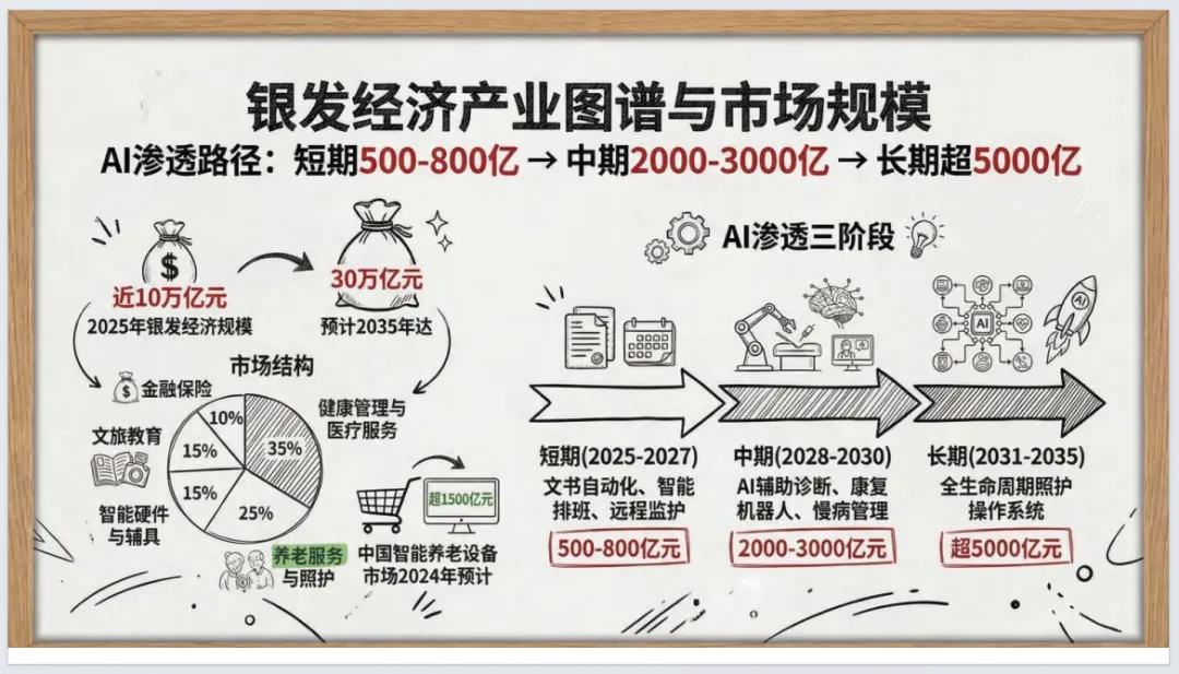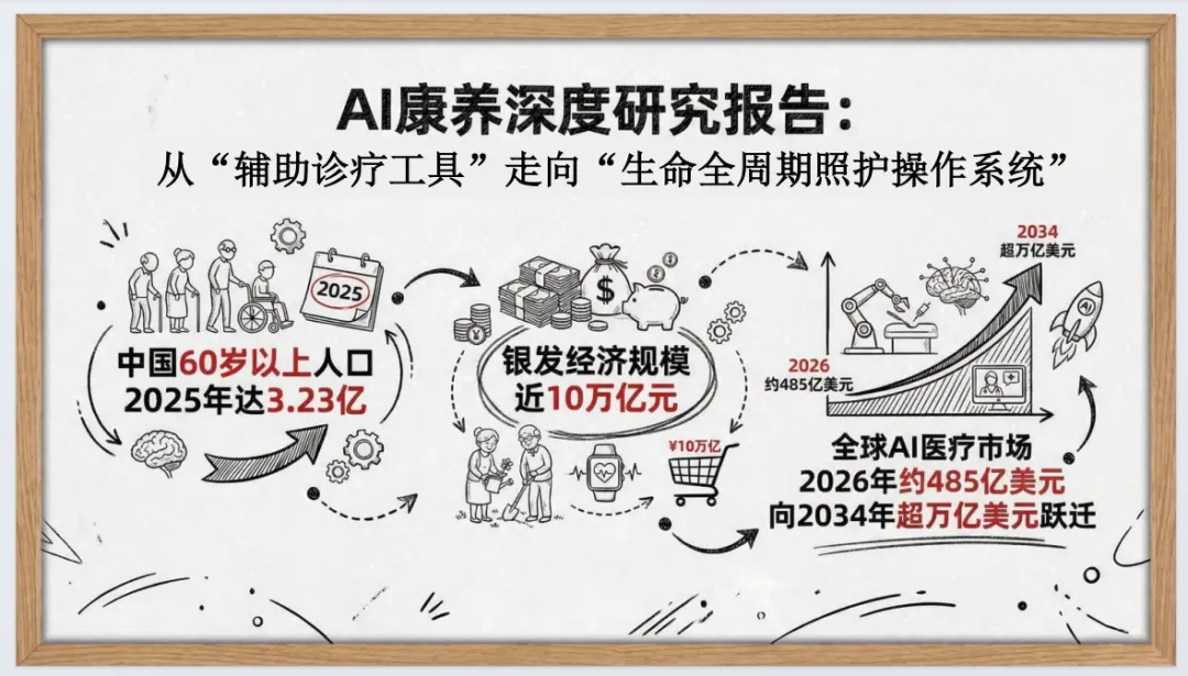 报告指出,银发经济向30万亿跃迁,AI是核心加速器,2026年成产业爆发拐点;全球AI医疗市场规模快速扩张,合规能力是长期护城河,垂直专业模型优于通用大模型。
