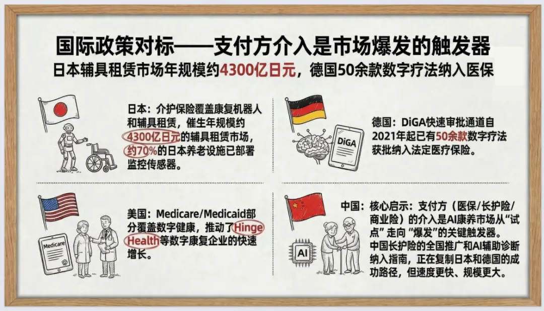 技术架构分感知辅具、数据中台、专业模型三层,行政型AI先爆发,养老机器人先专用后通用。四大核心闭环构成完整体系,居家成最大数据入口,B2B2G、按效果付费为主流模式。中国凭借基层场景密度、老年人口规模具备全球竞争优势,长护险覆盖与医保介入激活市场,适老化设计、人在回路机制是产品落地关键,技术需服务于老年照护尊严与人文关怀。