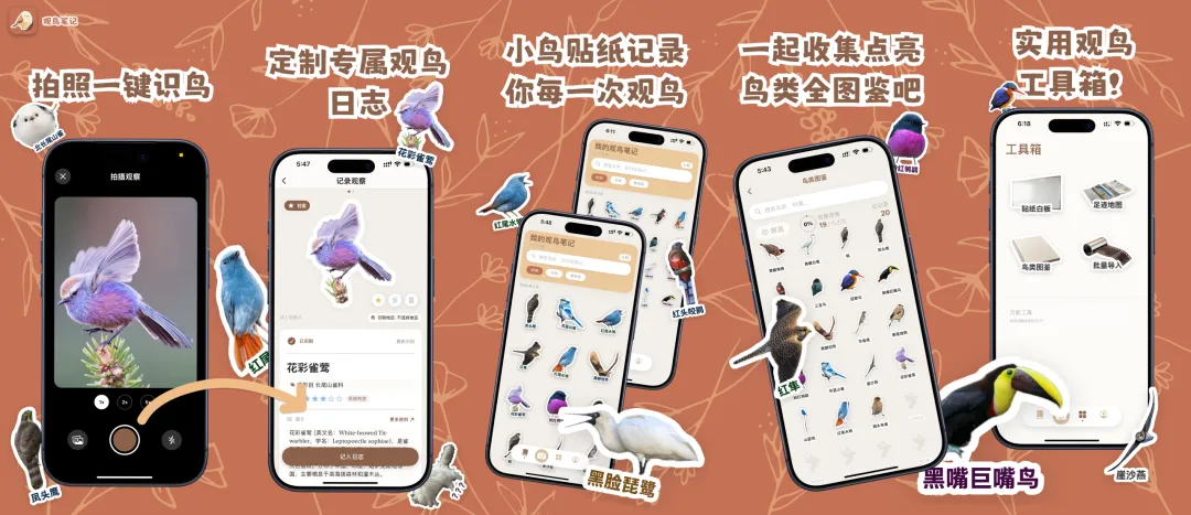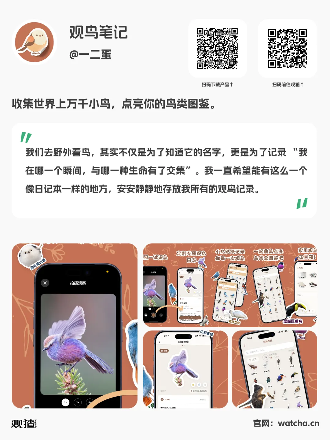 哈喽,大家可以叫我二蛋, 这次带来的新玩具叫「观鸟笔记」。简单来说,它不是一个用来查资料的厚重工具库,而是一个能帮你把每次在野外遇到的小鸟,变成可爱“贴纸”一样存起来的专属观鸟日记本。