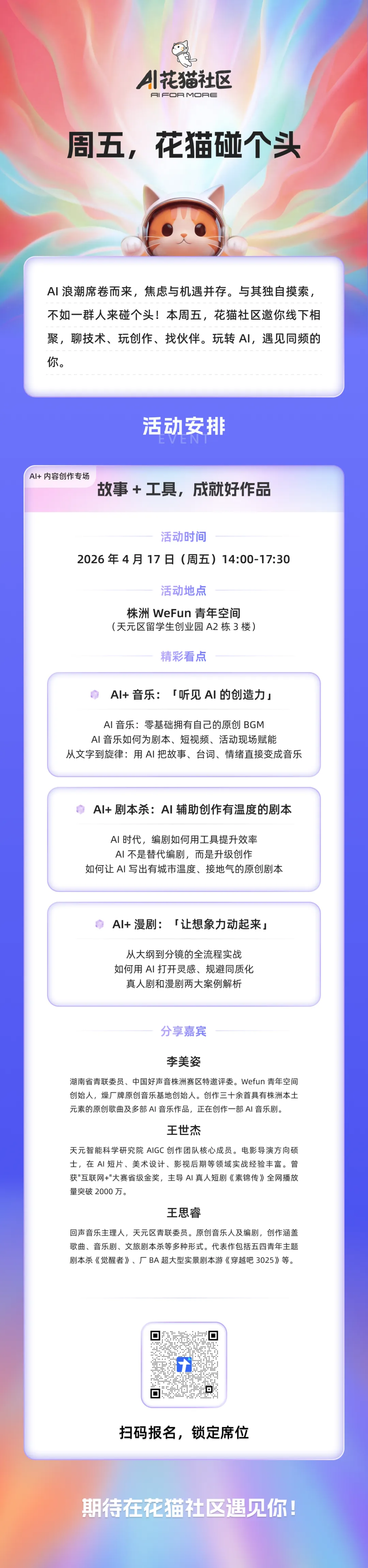 4月17日,周五花猫碰个头,我们想和你聊聊AI技术与内容创作的故事。