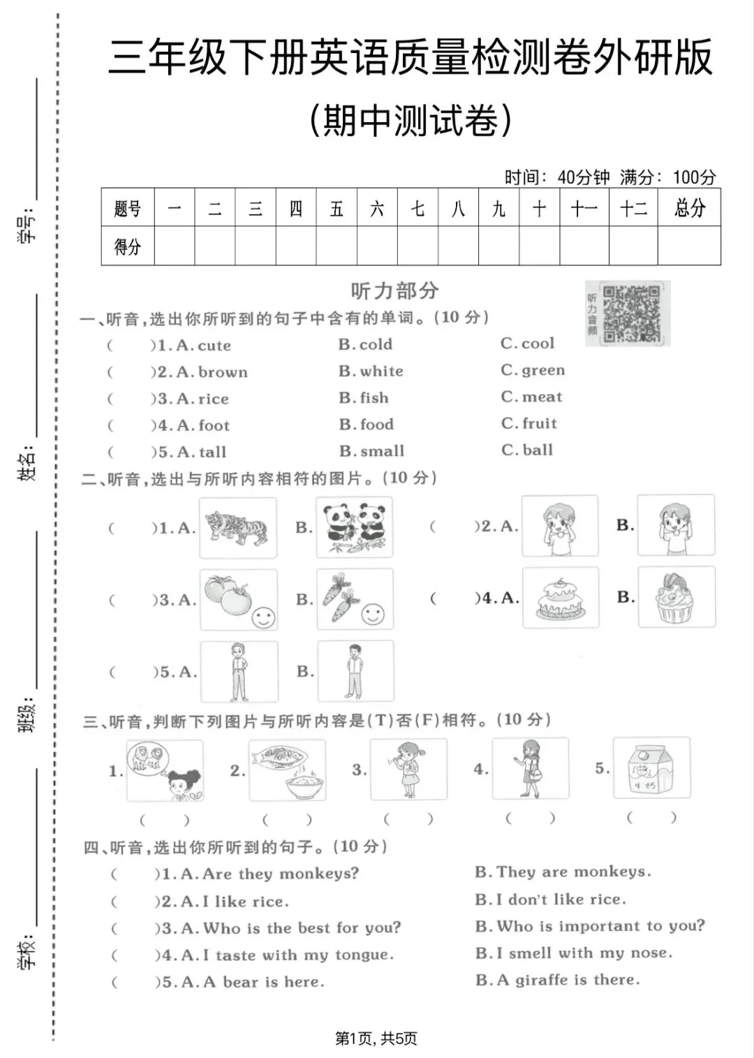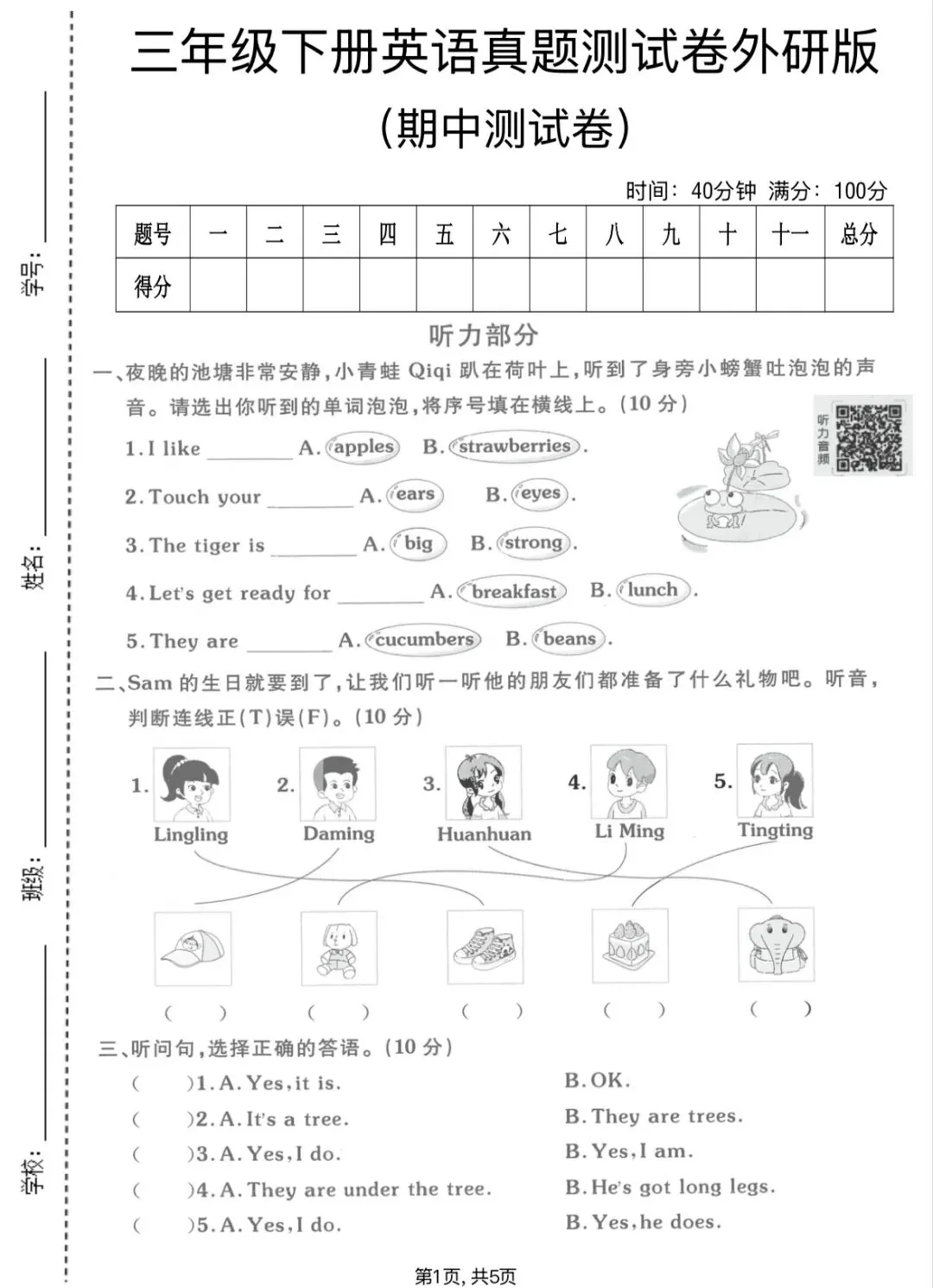 三年级下册英语外研版期中测试卷2套附答案(电子版可打印)