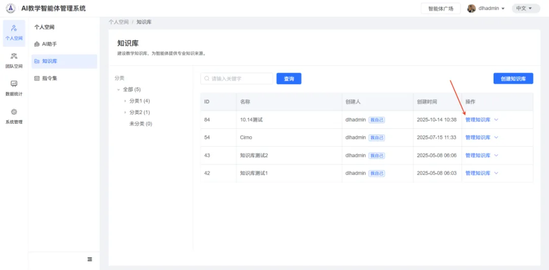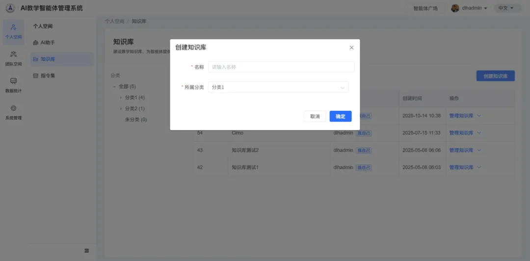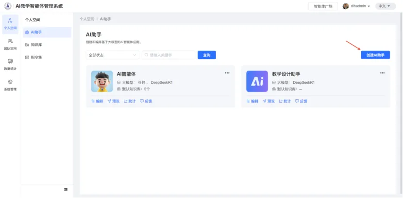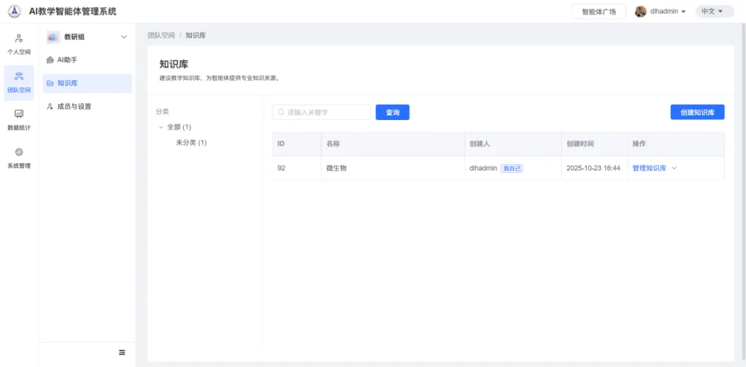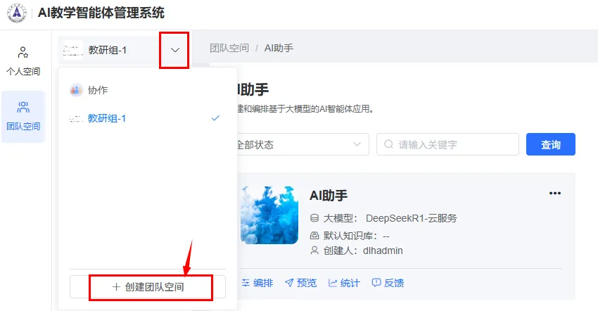 进入智能体管理系统之后,可直接在团队空间列表中创建新团队,自定义团队名称与相关设置。创建后,团队创建人自动成为管理员,拥有全面操作权限。