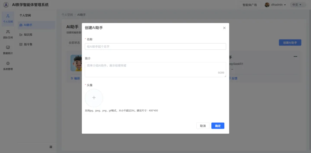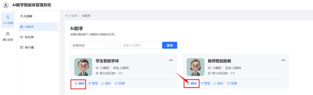 AI助手共建:团队成员可共同参与AI助手搭建,从名称、头像设计,到模型选择、人设编排,操作流程与个人空间一致,合力打造贴合团队教学需求的专属助手。