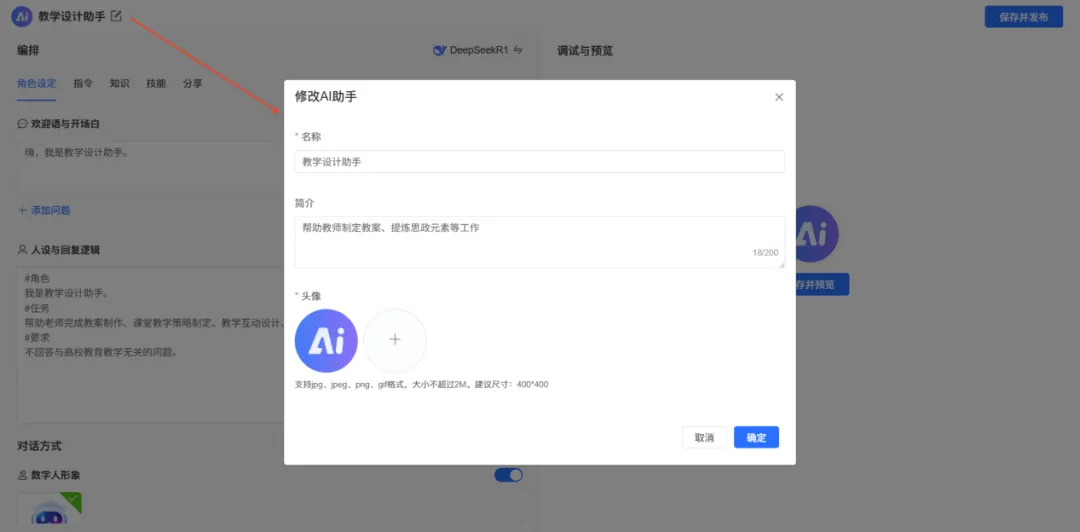 点击“创建AI助手”。可自定义设计AI助手的名称、简介、头像等。