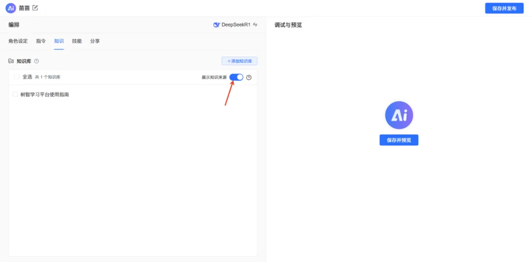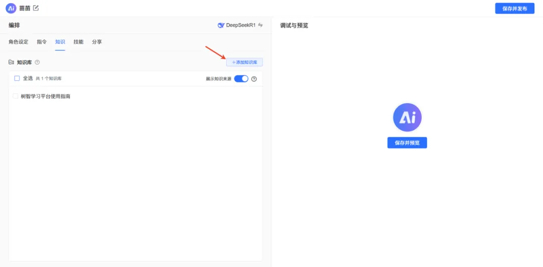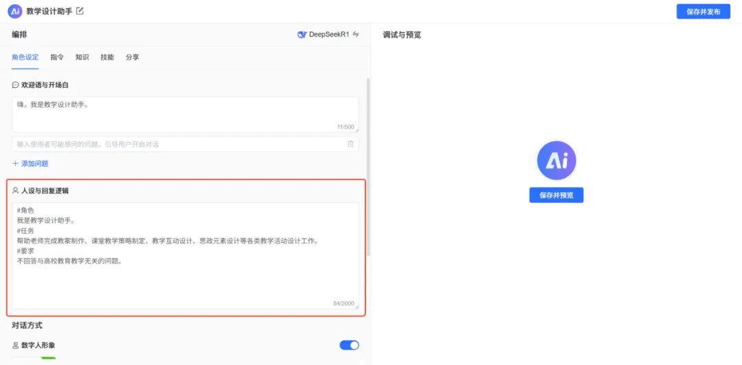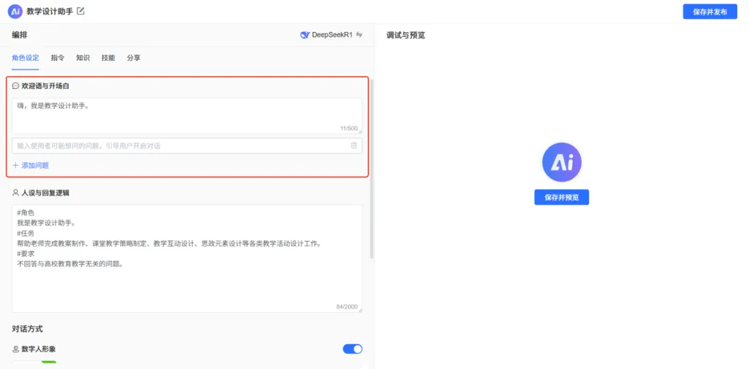 编排完成的AI助手,保存预览即可同步查看效果;点击“保存并发布”,可将其从草稿状态改为已发布状态,后续可在班课等模块调用。