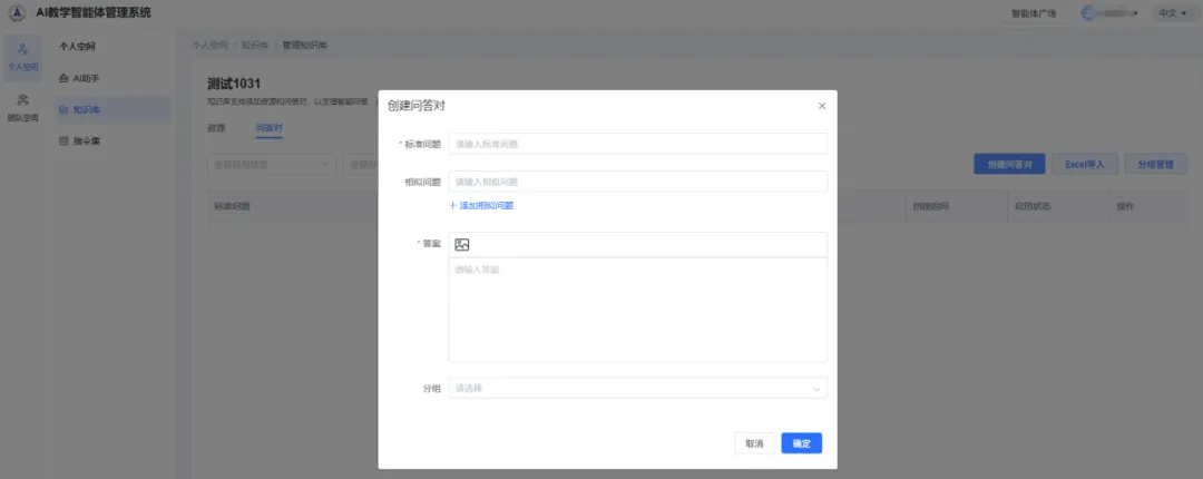 “问答对”作为知识库的核心交互模块,可提前预设师生高频疑问及对应标准答案,支持 AI 助手快速精准匹配查询需求,无需冗余运算即可即时反馈,既能降低教师重复答疑的时间成本,又能保障回复的专业性与一致性。