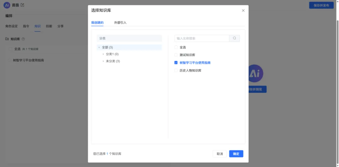 可从自己创建的知识库和外部引入的知识库中选择知识库关联到AI助手,用于支撑智能问答、AI出题。