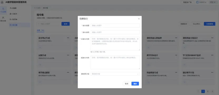 在指令集管理页面,支持创建新指令,可按需设置指令标题、指令说明、长短指令内容及指令分组,满足多样化使用需求。