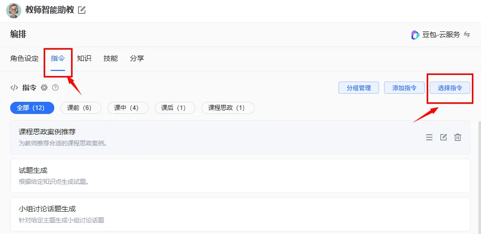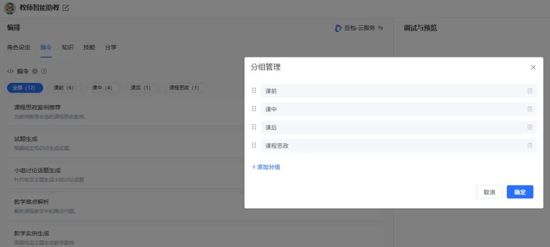 在AI助手编排页面,可对AI助手的指令进行设置,包括添加指令和分组管理。选择已创建好的指令,即可把指令与AI助手进行关联。