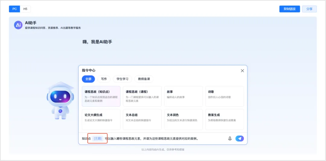 指令集是AI助手的“快捷任务手册”,通过预设标准化、场景化的指令模板,让教师无需重复输入复杂需求,一键触发AI完成特定教学任务,大幅提升交互效率。