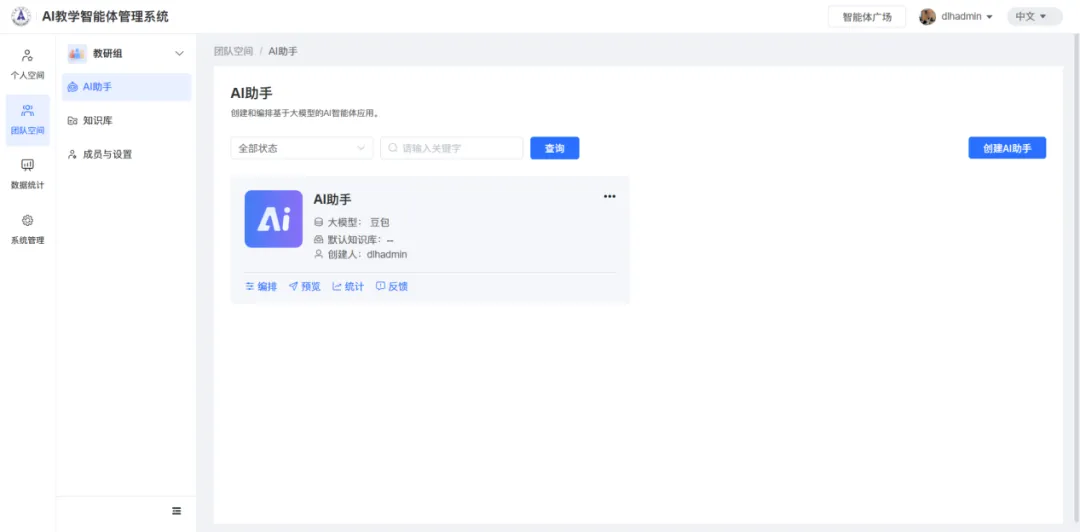 团队空间支持多位教师、管理员共建共享 AI 助手与知识库,打破个人创作壁垒,让教学智慧高效流转,协同备课更省心。