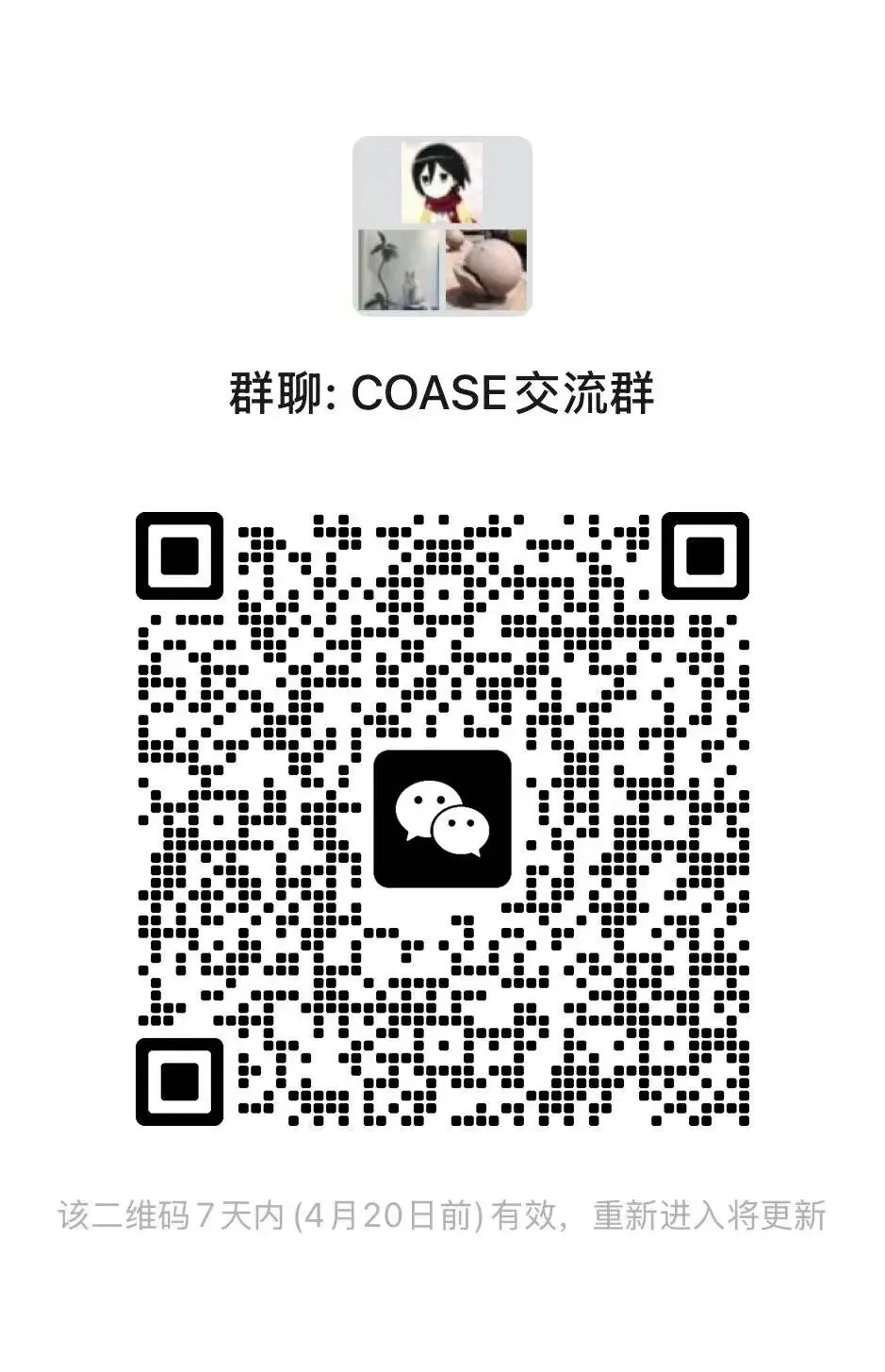 此外,我们也建立了COASE后续交流群,就安装、操作和应用过程中的常见问题进行交流,也可以向我们反馈使用中的问题与建议,帮助我们进一步完善产品,建议大家在使用前先加群~。也欢迎在这个公众号后台向我们留言。