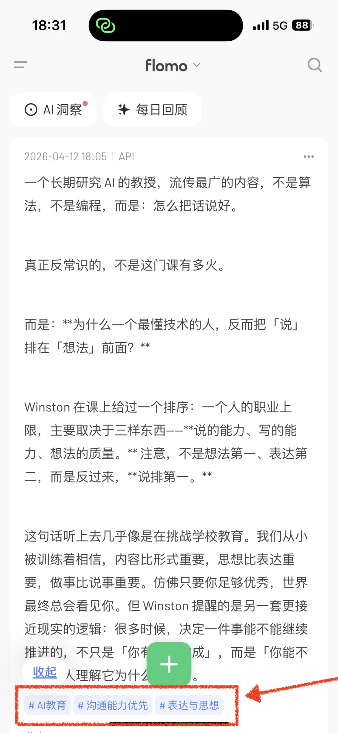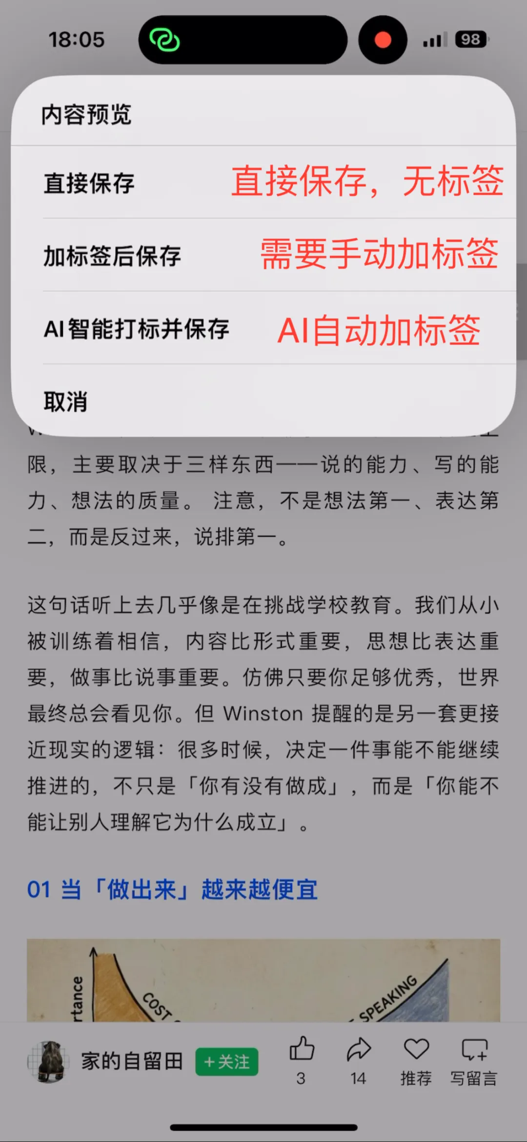 AI 会自动提炼标签,内容同时写入 flomo 和 Obsidian,排版完整保留。