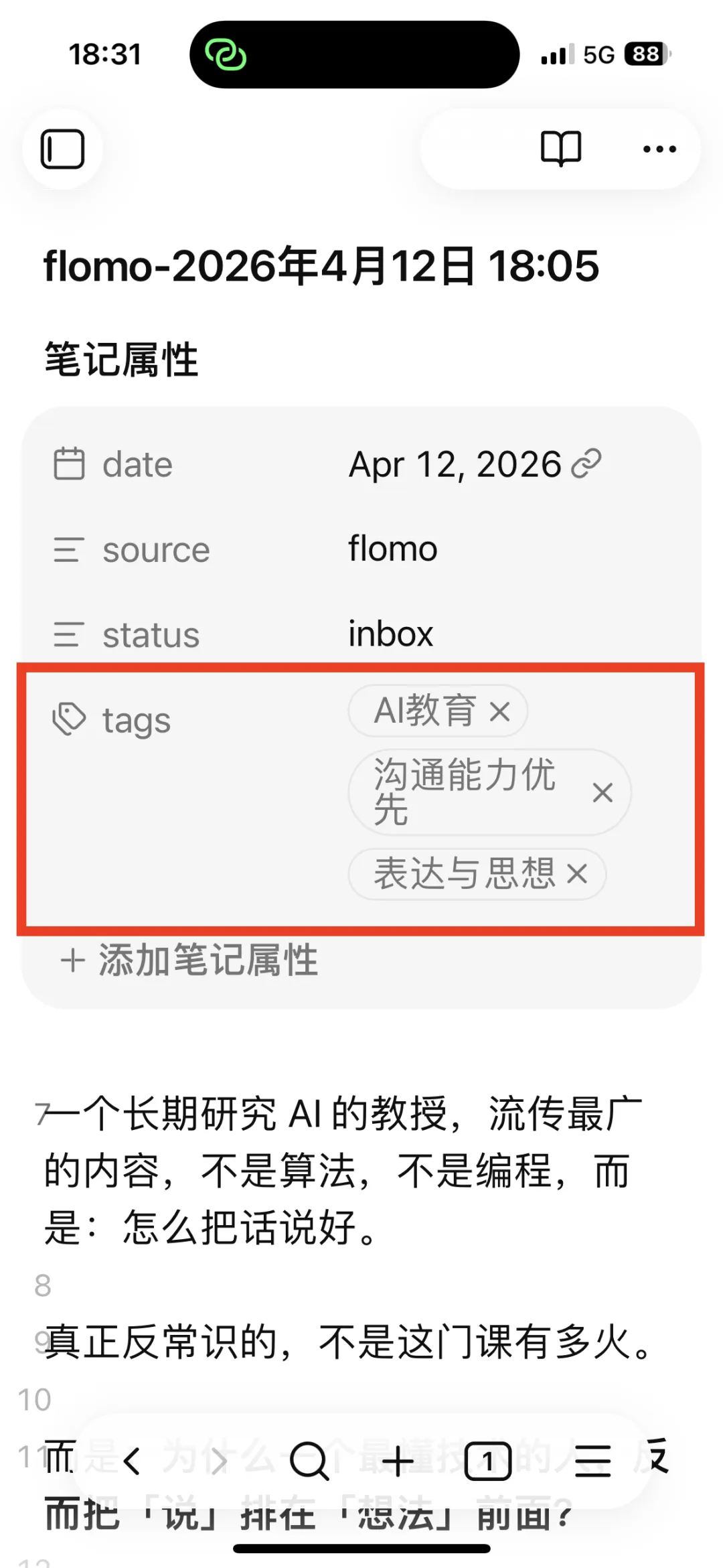 flomo 那边是带 #标签 的卡片,适合快速回顾;Obsidian 这边是带 YAML 属性头的 .md 文件,直接进入本地知识库的 Inbox,标签干干净净地躺在 Properties 里,等你后续做关联。