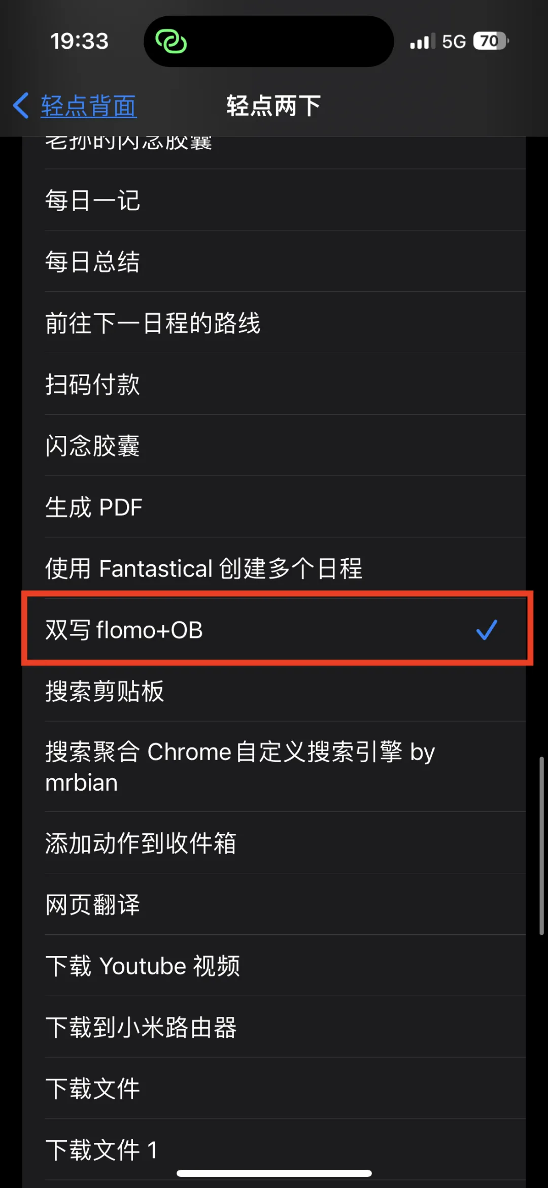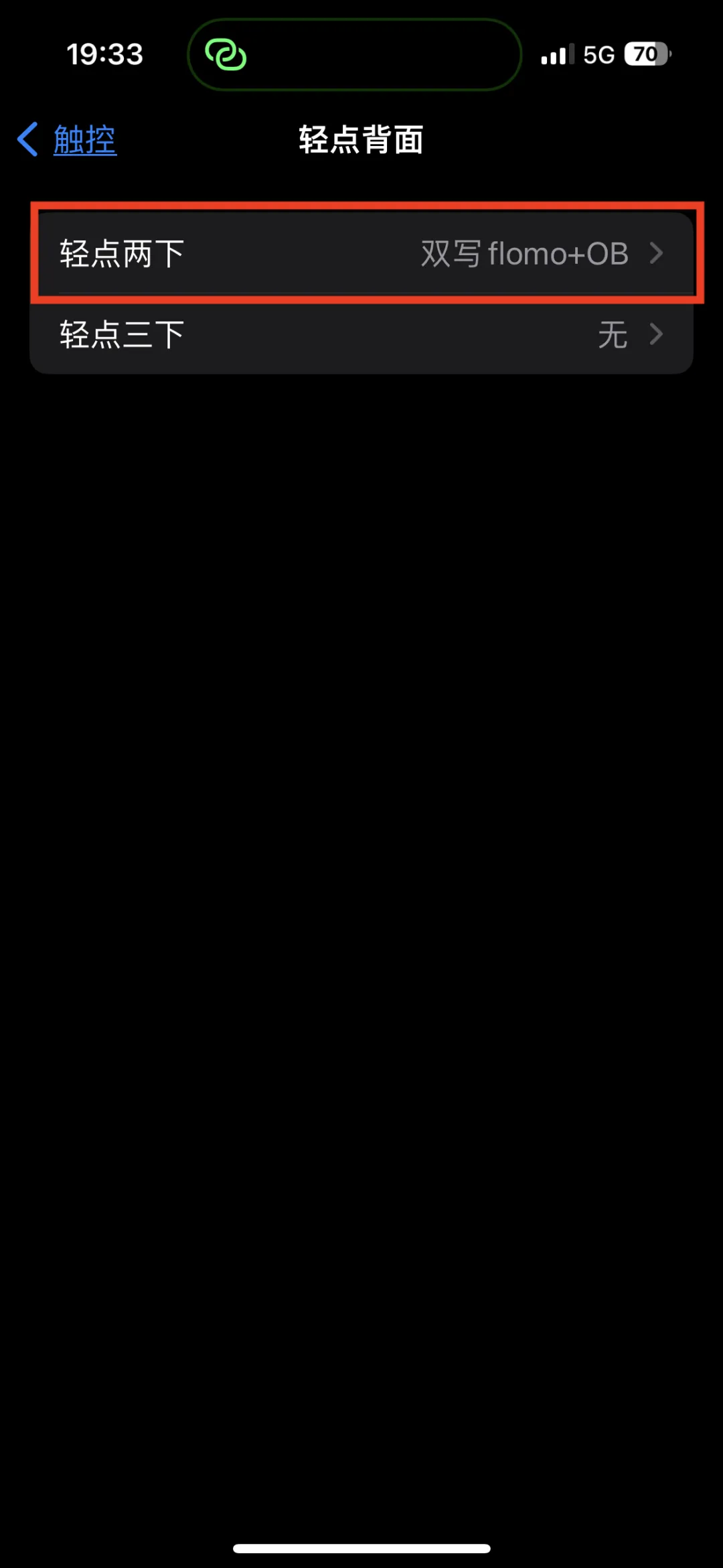 把快捷指令绑定到 iOS 的”轻点背面两下”(设置 → 辅助功能 → 触控 → 轻点背面 → 轻点两下 → 选择“双写flomo+OB”),或者放进控制中心的悬浮球。