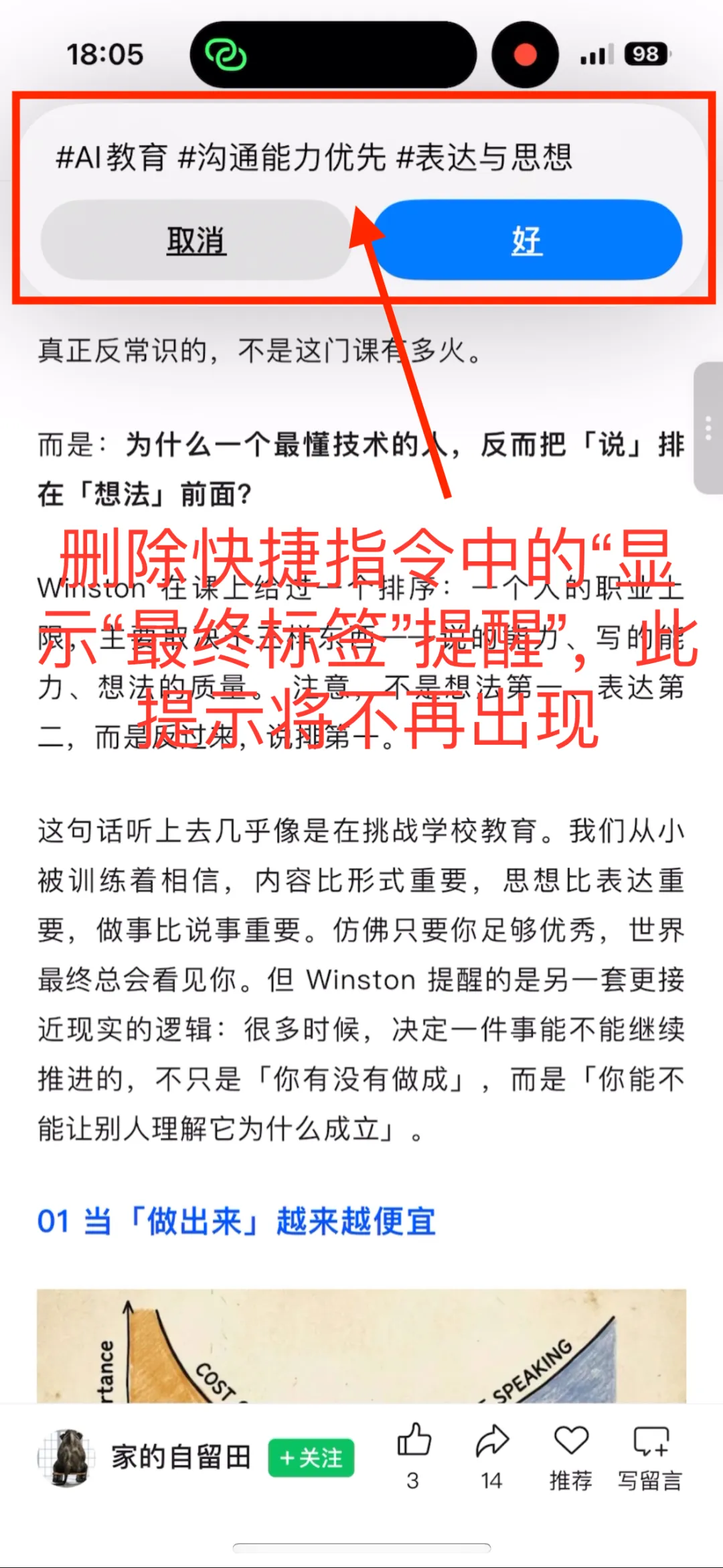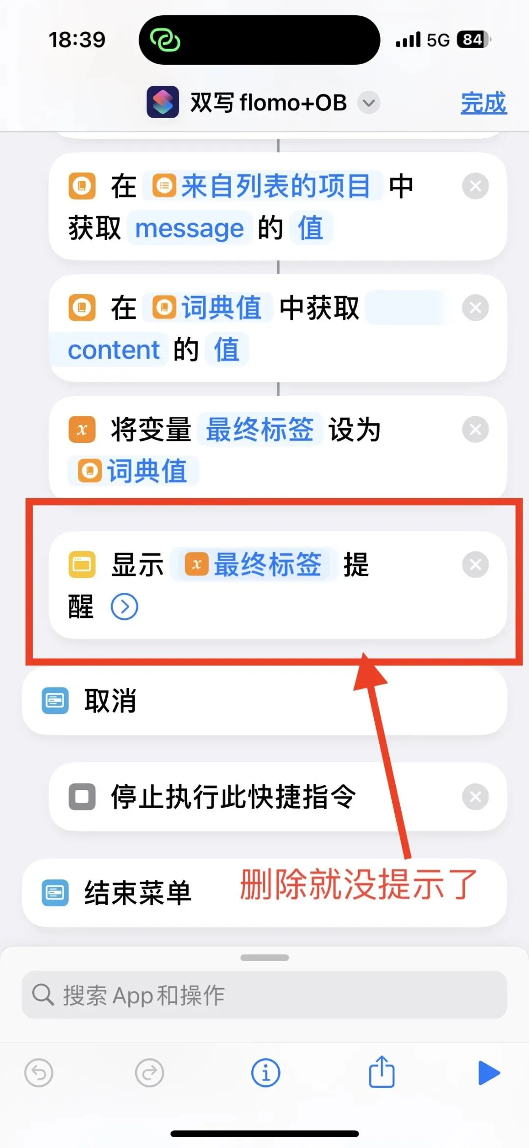 如果不想在转存时,看到手机桌面弹出的“标签”提示框,可以将快捷指令中的“显示‘最终标签’提醒”删除,则以后始终都是静默保存。
