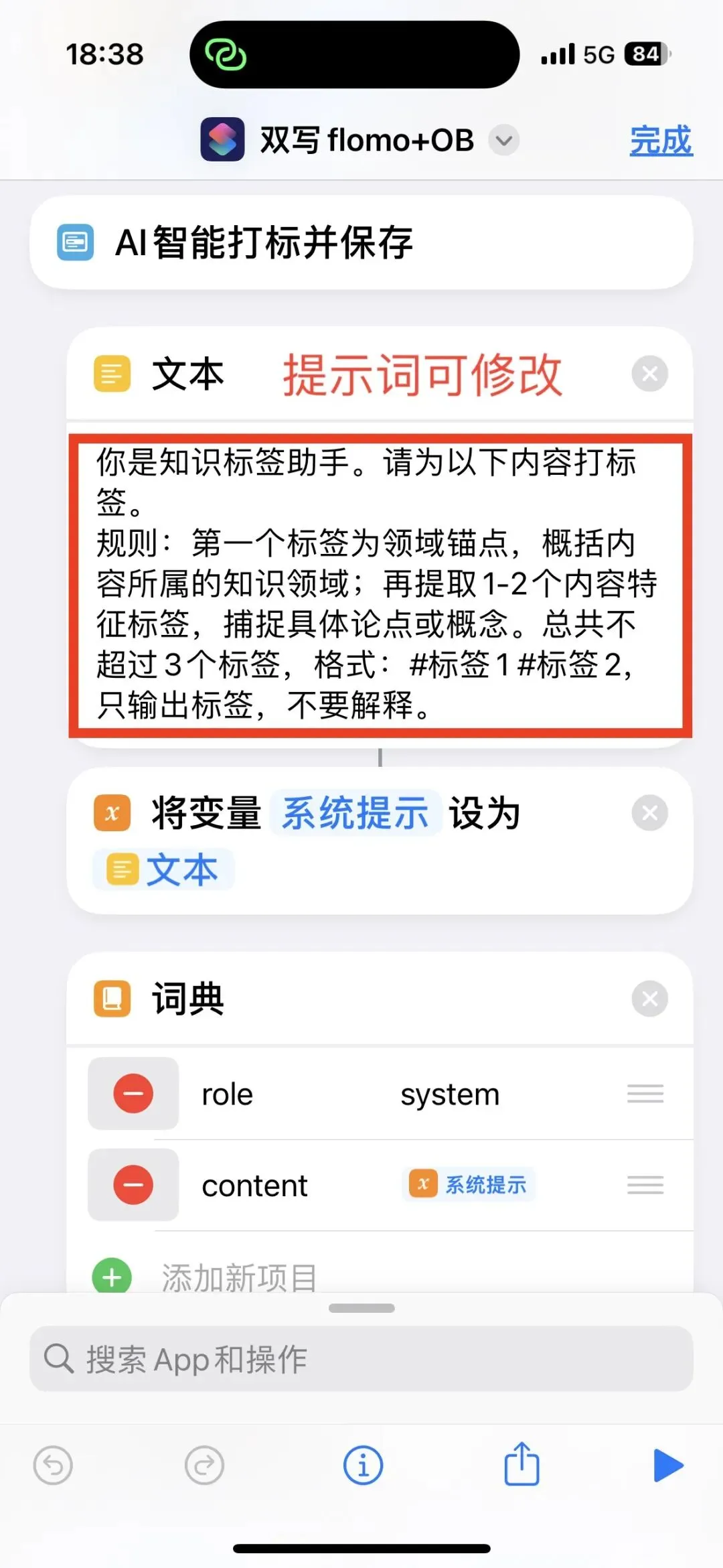 如果不想让AI仅有打标签功能,比如想让AI做智能总结,则可在下方图片中显示的快捷指令中,修改相应的prompt即可。