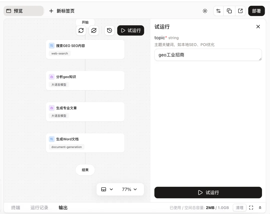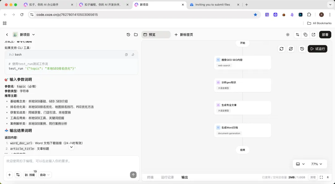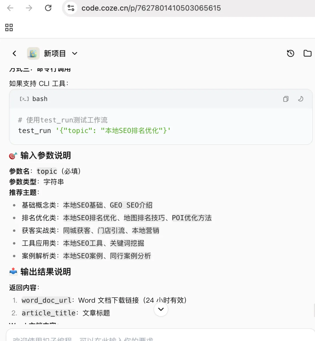 我手头有个项目,叫GEO本地SEO公众号智能内容生成工作流。名字挺长的,但功能确实对得起这个名字。它跑在Coze平台上,就是一个AI智能体平台,字节跳动旗下的。