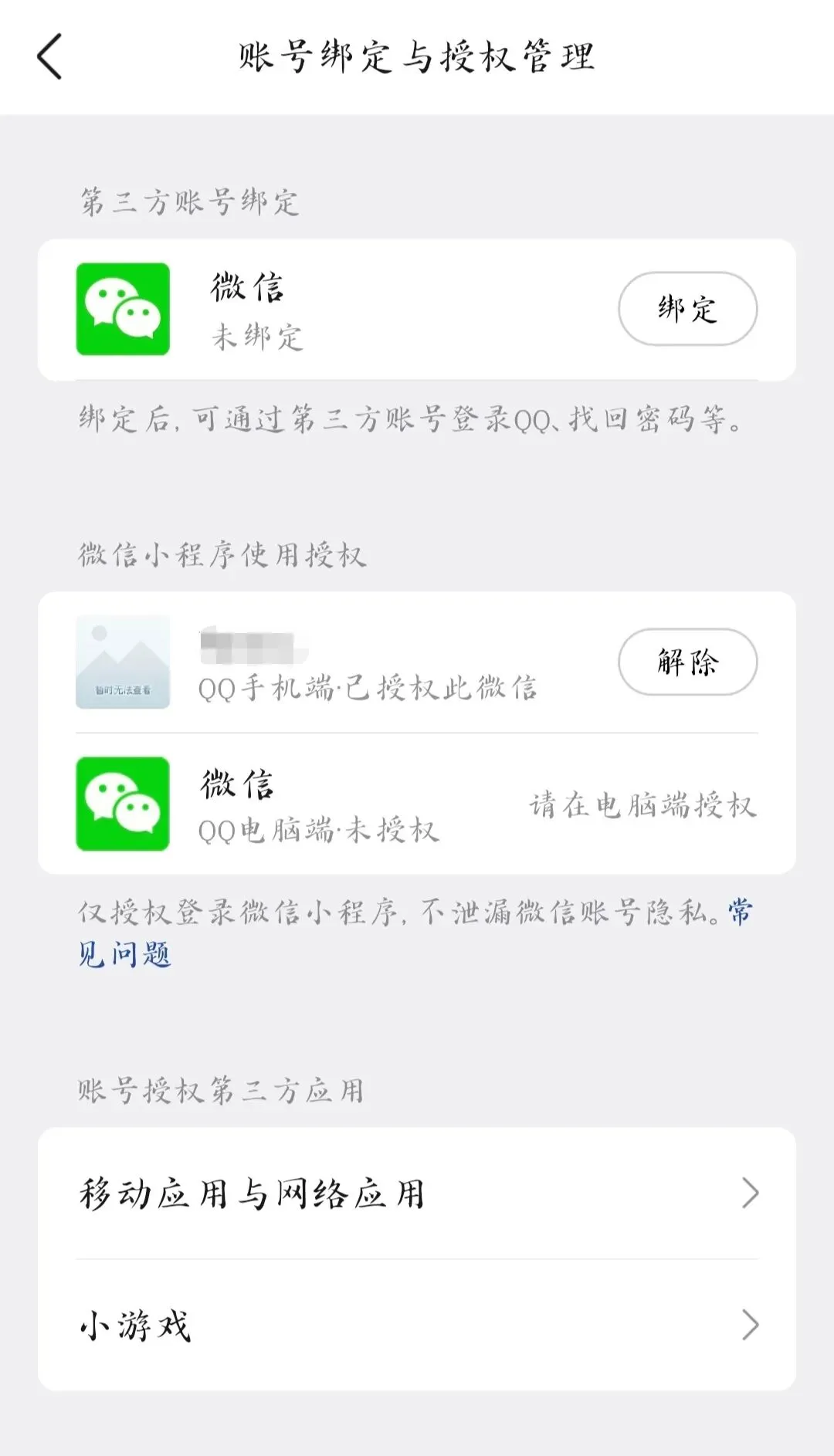 2.点击【移动应用与网络应用】、【小游戏】,就可以看到所有用QQ登录过的应用列表。点击要解绑的应用,再点击【解除授权】就完成了。