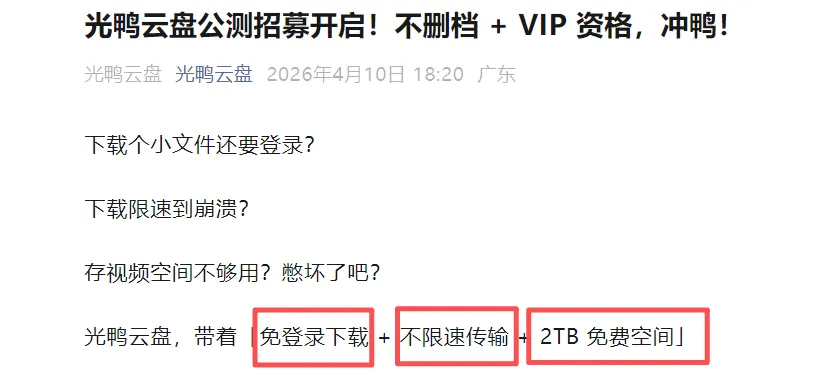Nas硬盘不够?网盘来凑!光鸭网盘免费领2T空间!免登录下载!不限速传输!还能抽VIP!这羊毛你不薅?