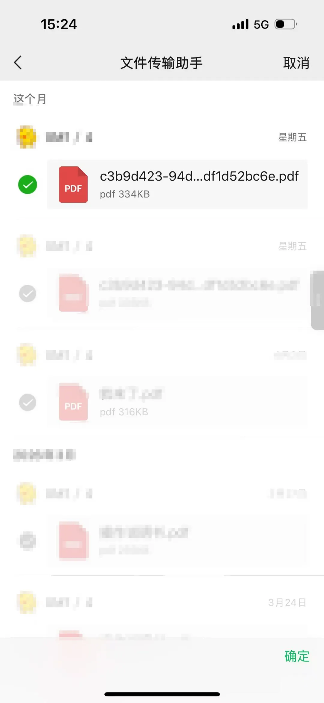 然后,我们可以在我们的微信聊天记录里面,找到我们的PDF文件,当然,我们需要先把文件发送到微信。作为我们要去除水印的PDF文件。